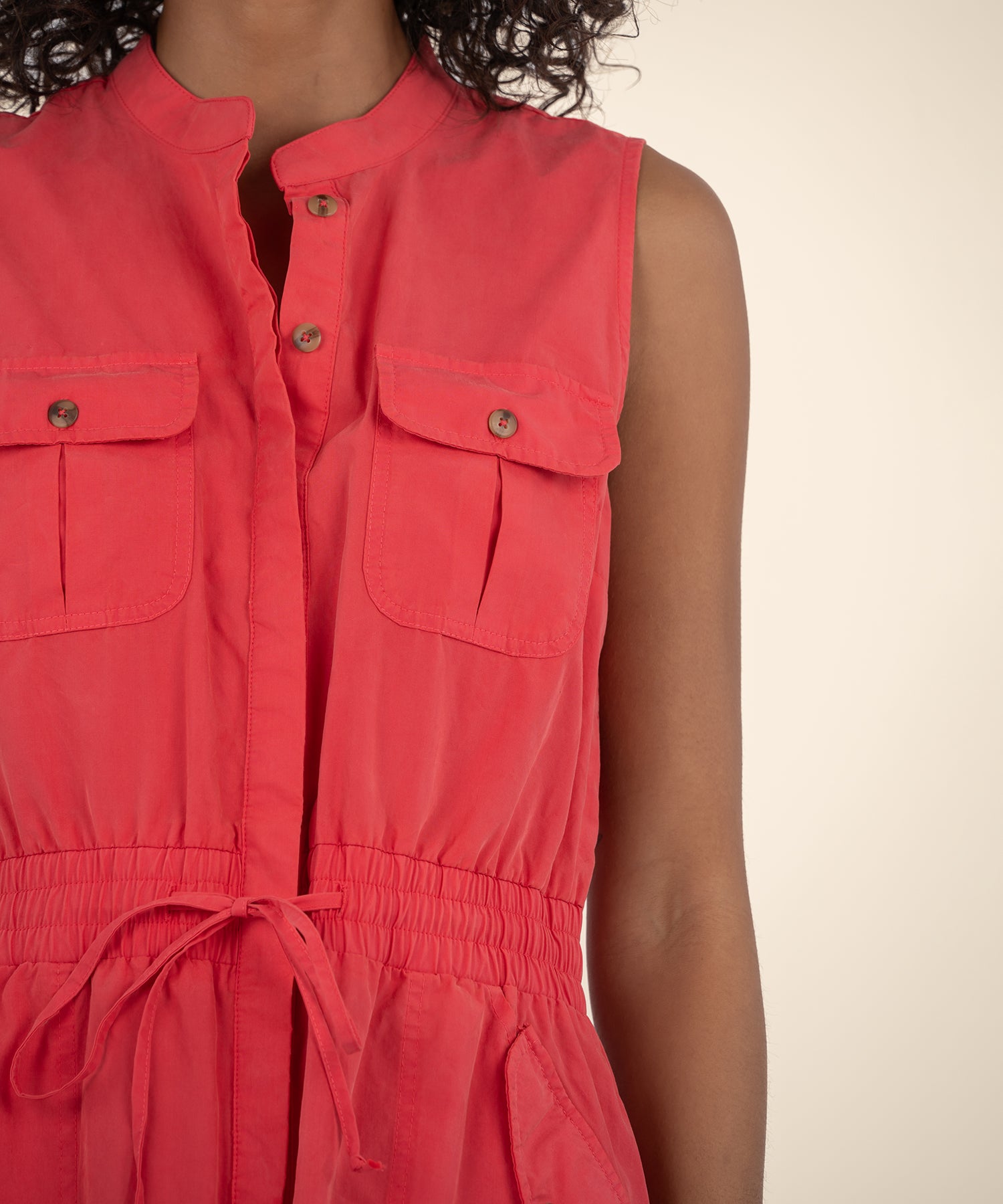 - This poppy-colored utility dress blends style and practicality with multiple front pockets and a button-down front. The waist tie adds shape, making it a versatile and chic wardrobe essential.