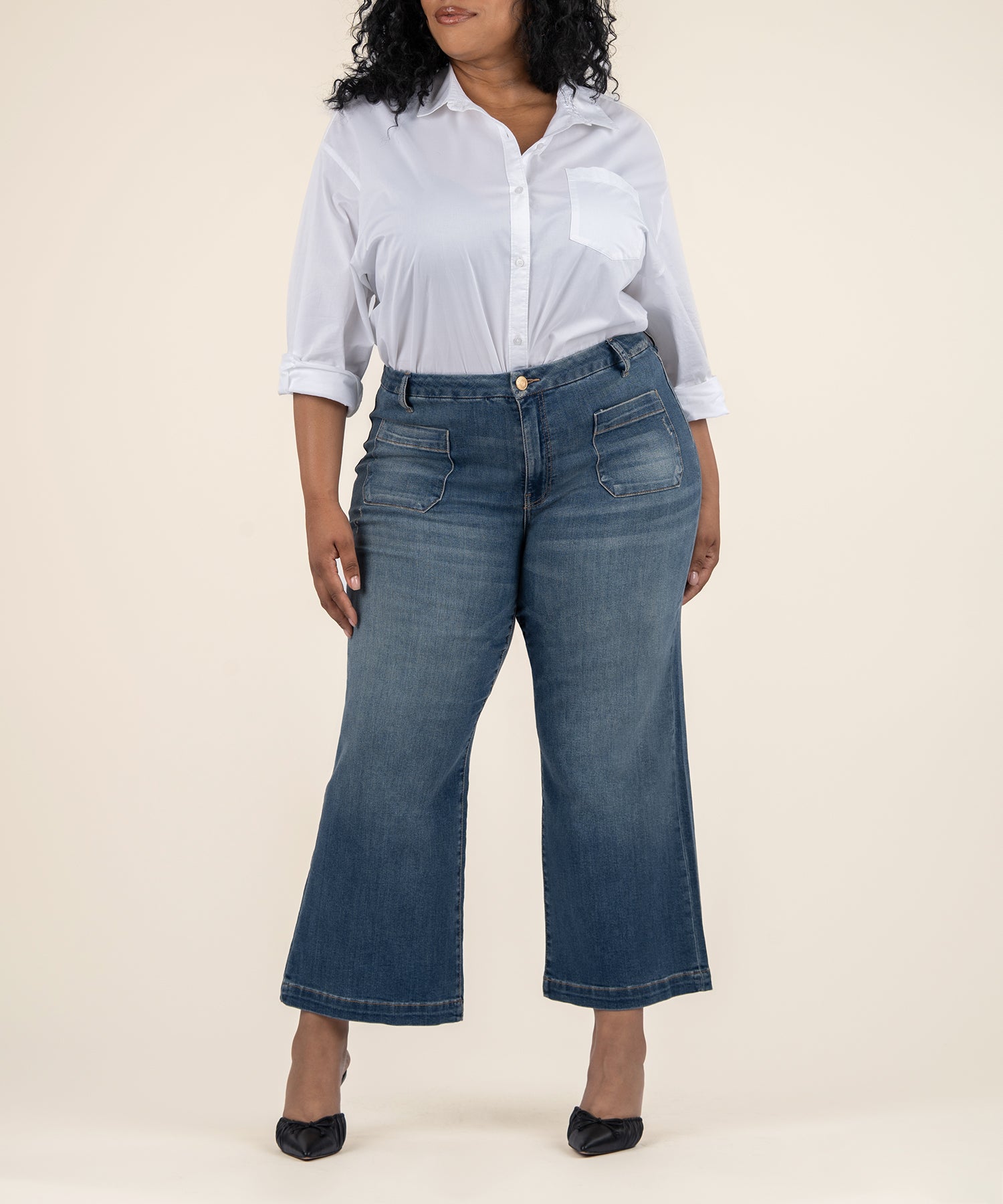 - Elevate your denim collection with these high-rise wide-leg jeans, featuring distinctive patch pockets and a clean regular hem. The relaxed fit combines comfort with bold style, making them a standout piece that effortlessly enhances any look.