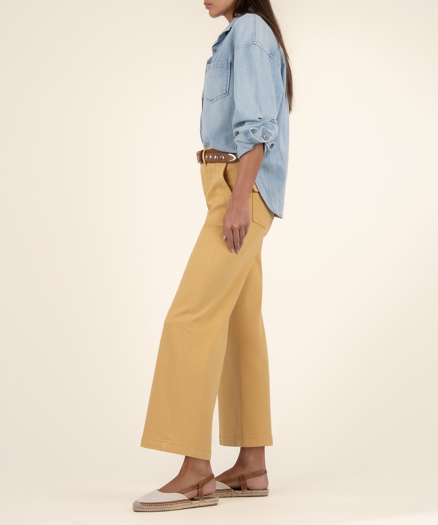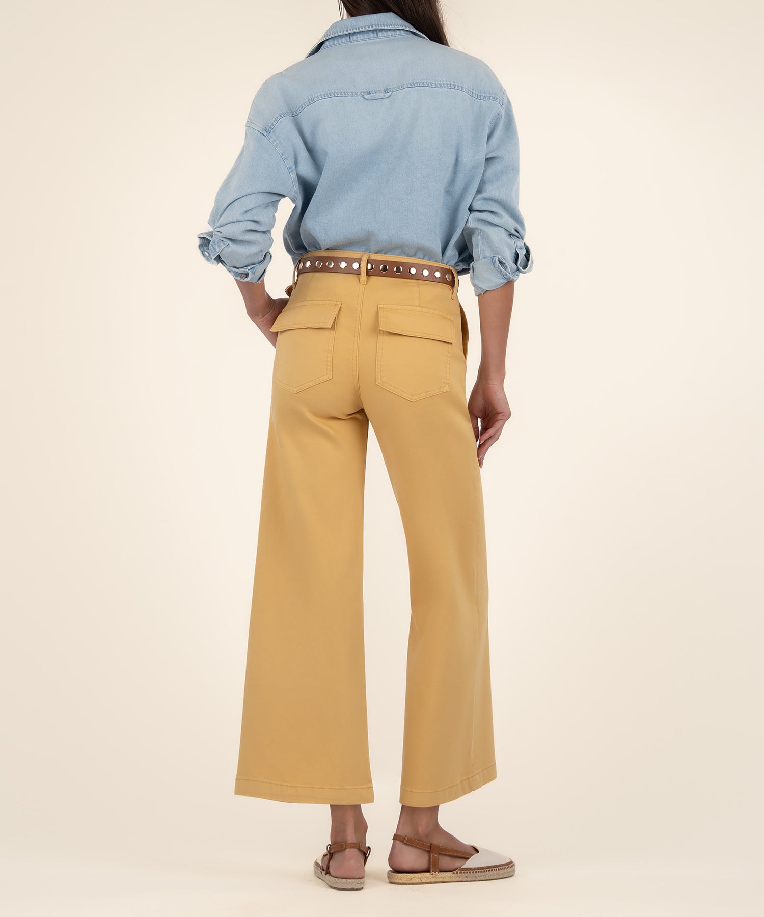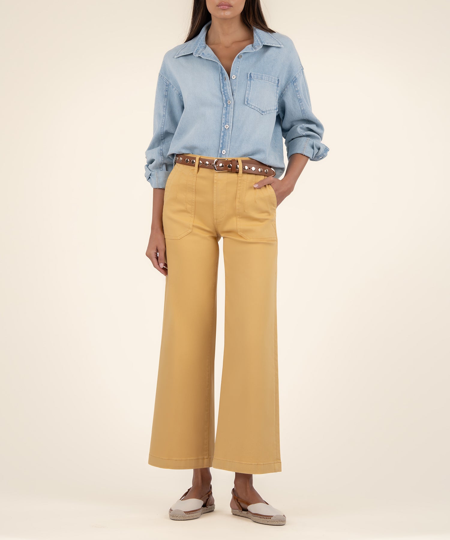 • Brighten up your wardrobe with these high rise pants in a vibrant Dandelion hue. The wide leg silhouette offers effortless flow, while the unique pork chop pockets add a functional yet stylish edge.