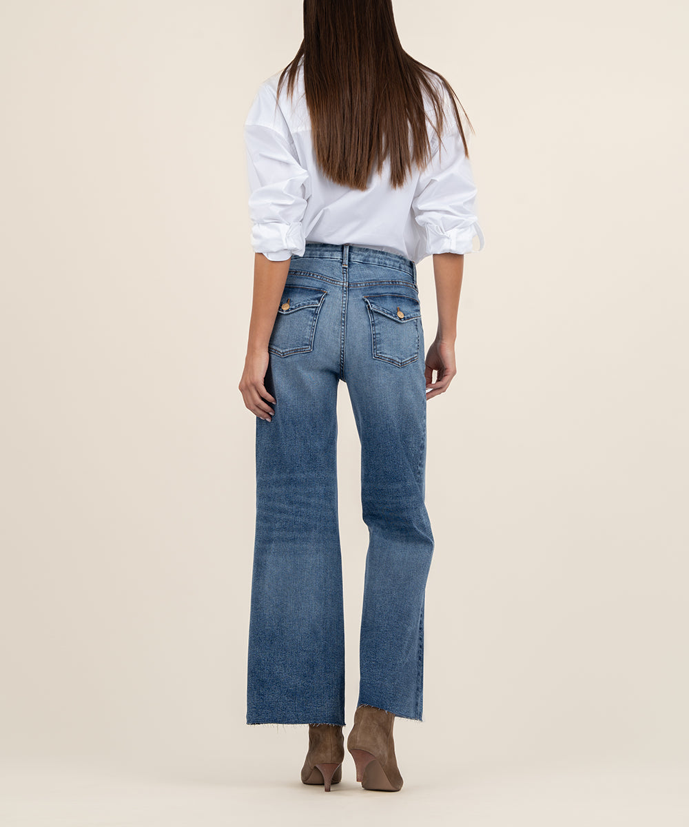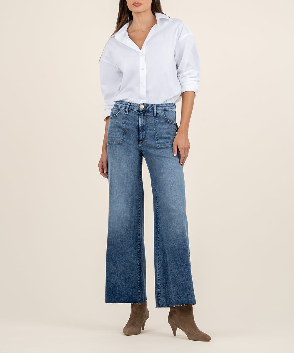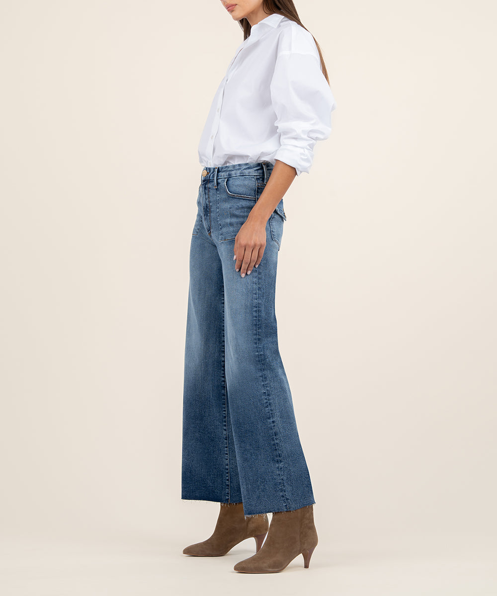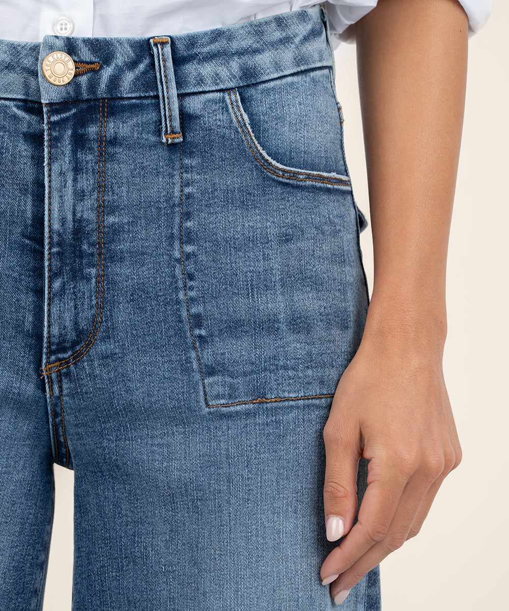 • Patch pockets bring a playful retro vibe to these wide-leg jeans made from faded stretch denim in a high rise fit and raw hems.