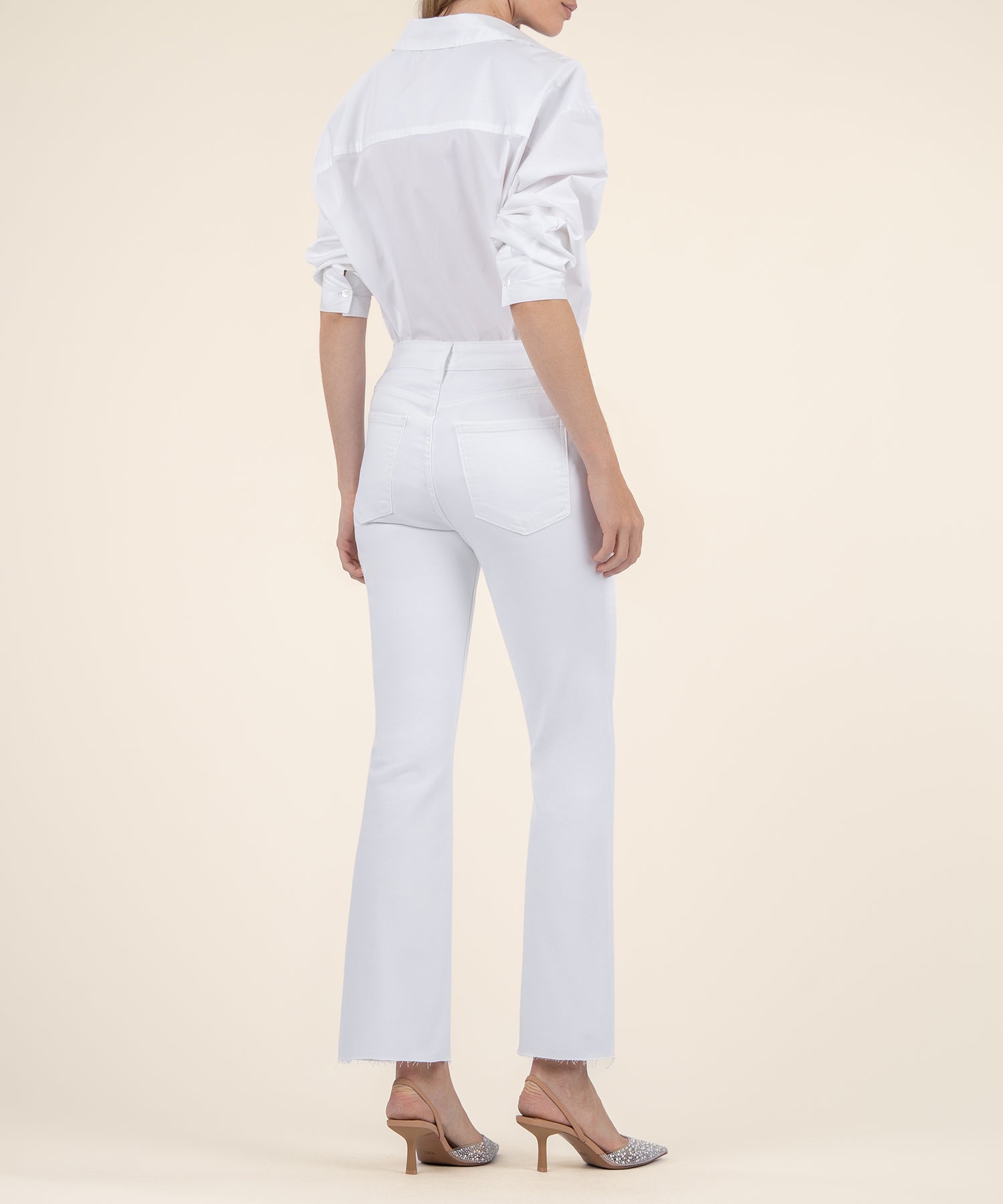 • Raw hems add an edgy detail to bright-white flare jeans made from soft stretch denim and cropped to an ankle length.