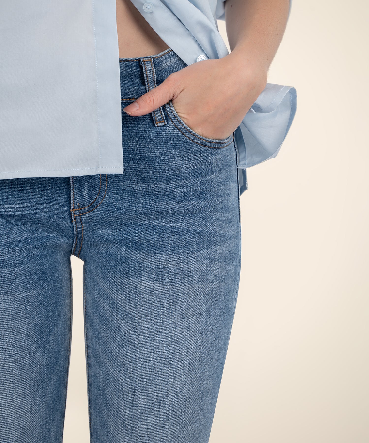 • Softly frayed, easy-to-cuff hems add to the laid-back look of these stretchy, slim-cut straight-leg jeans with a double button high waist.