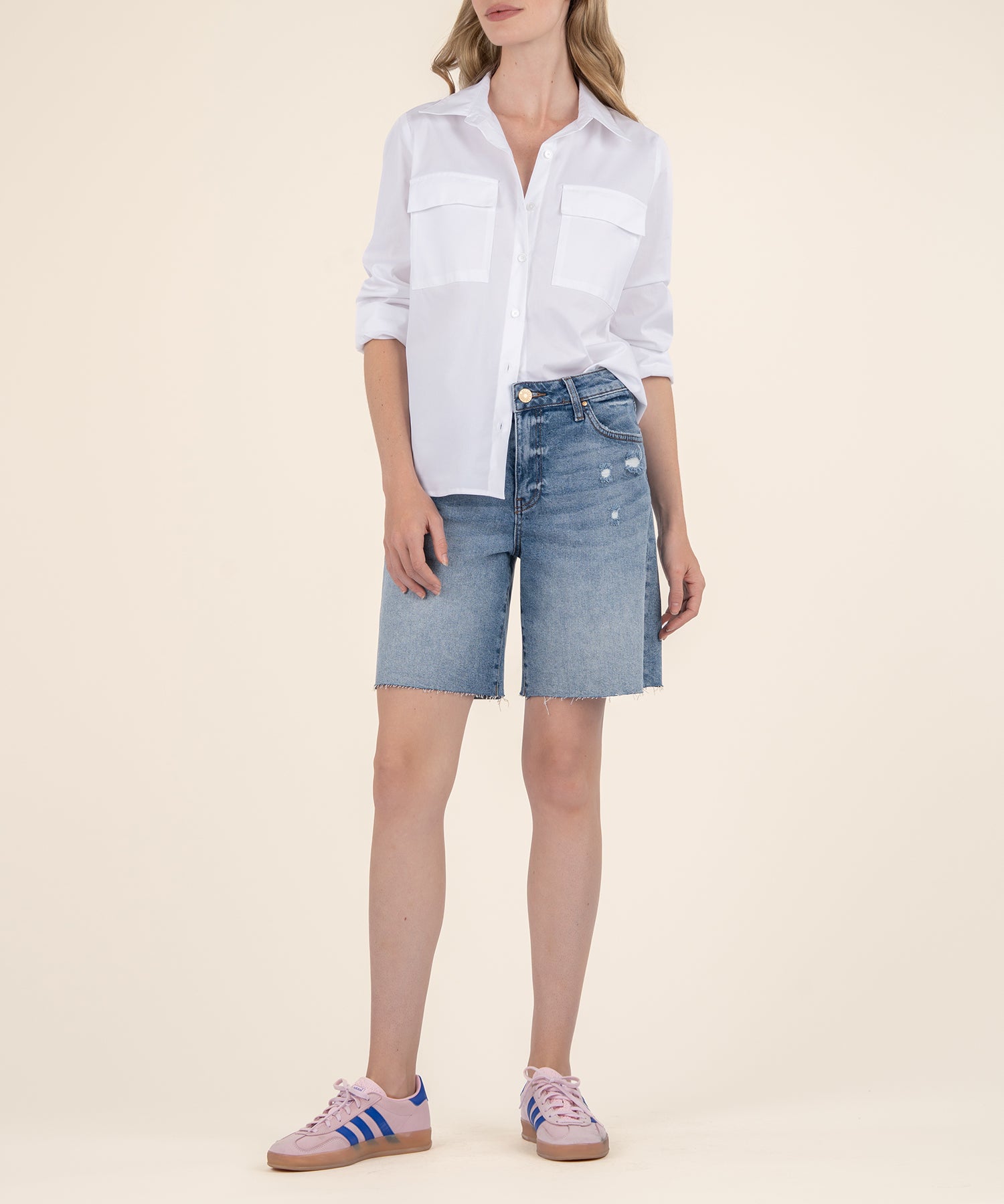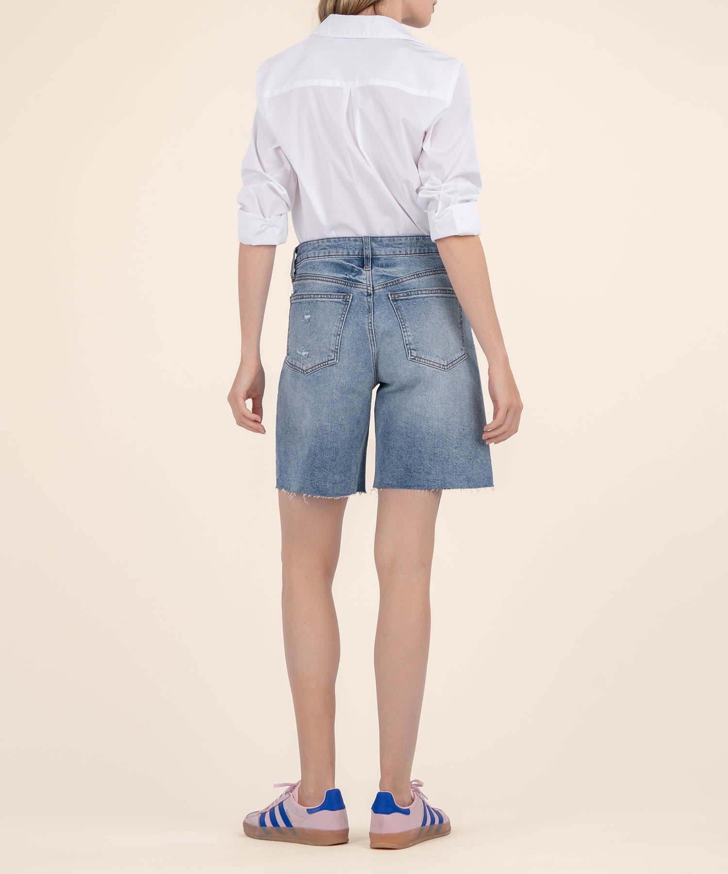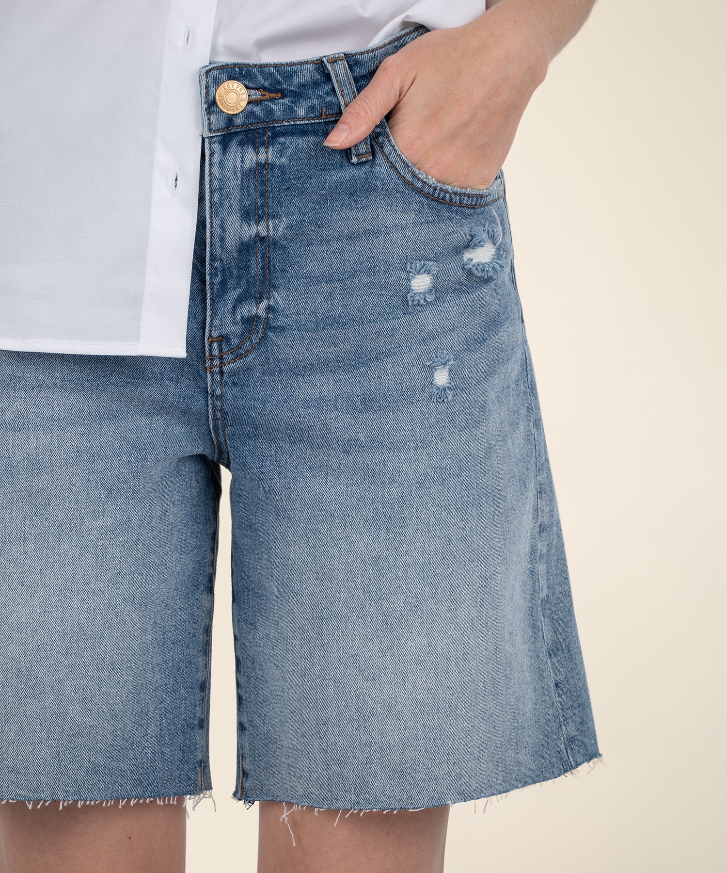 • Tailored long Bermuda shorts in a soft light wash, finished with a raw hem and a touch of delicate distressing. A casual vintage look elevated for modern ease.