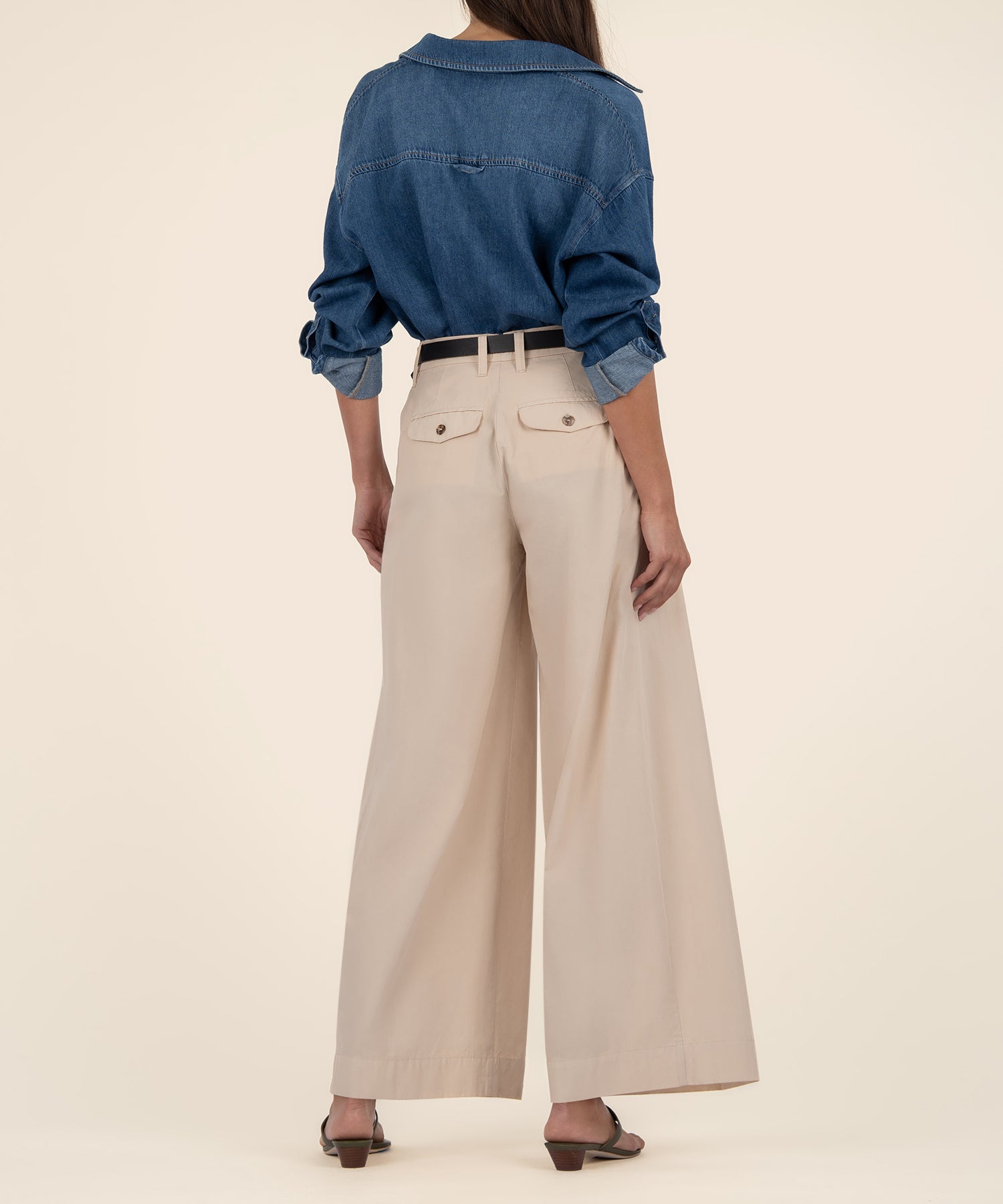 - These high-rise pants feature a classic wide leg cut and structured front pleats, offering a clean, timeless look. Easy to dress up or down, they’re a versatile addition to any wardrobe.