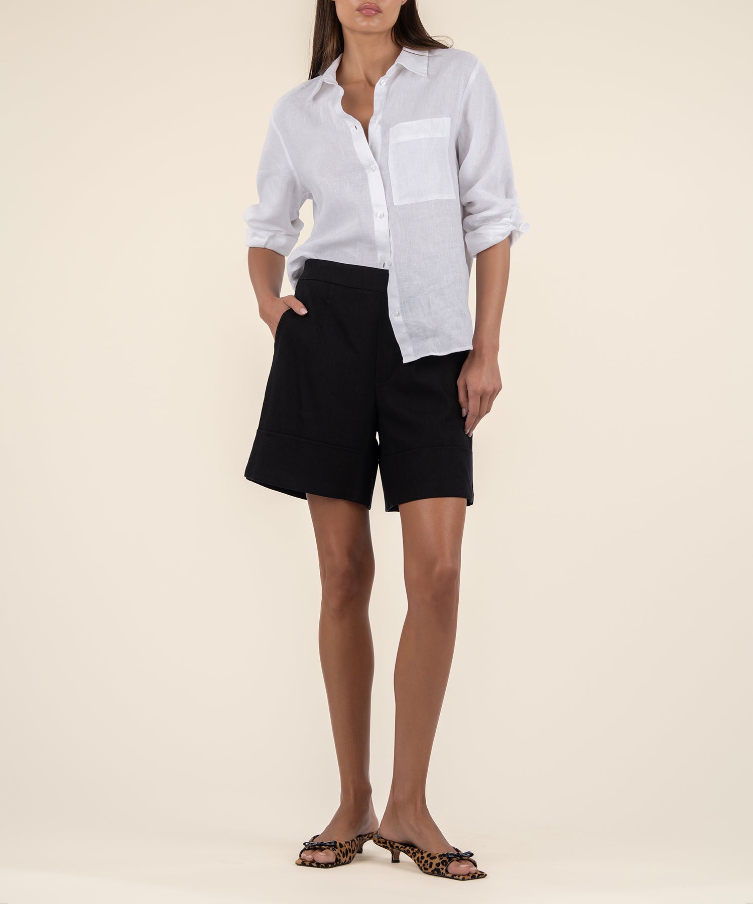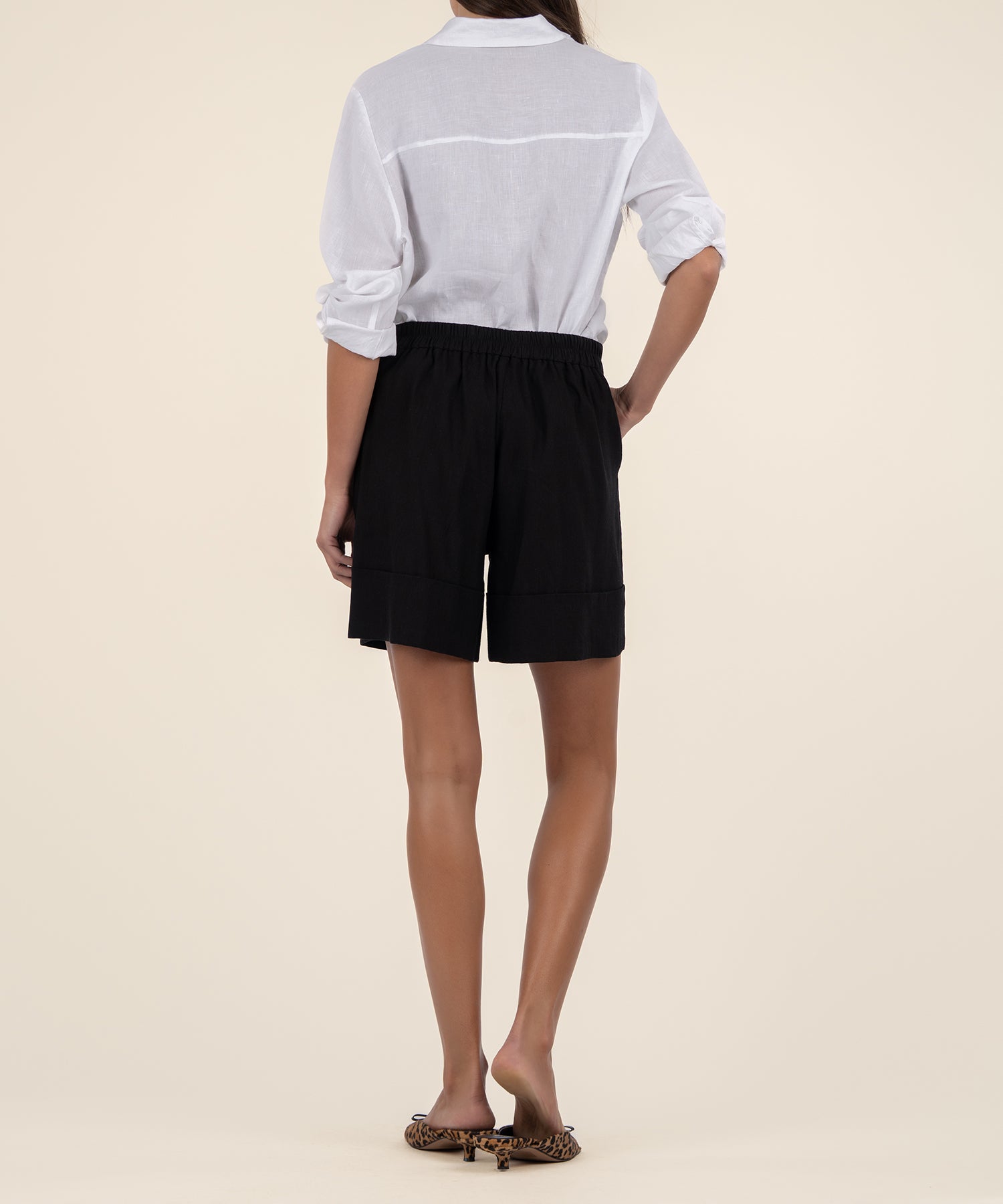 - These relaxed shorts are crafted from a breathable linen blend material, perfect for warm-weather days. They’re designed with an elastic waist for all-day comfort and feature a subtle hem detail for a clean finish.