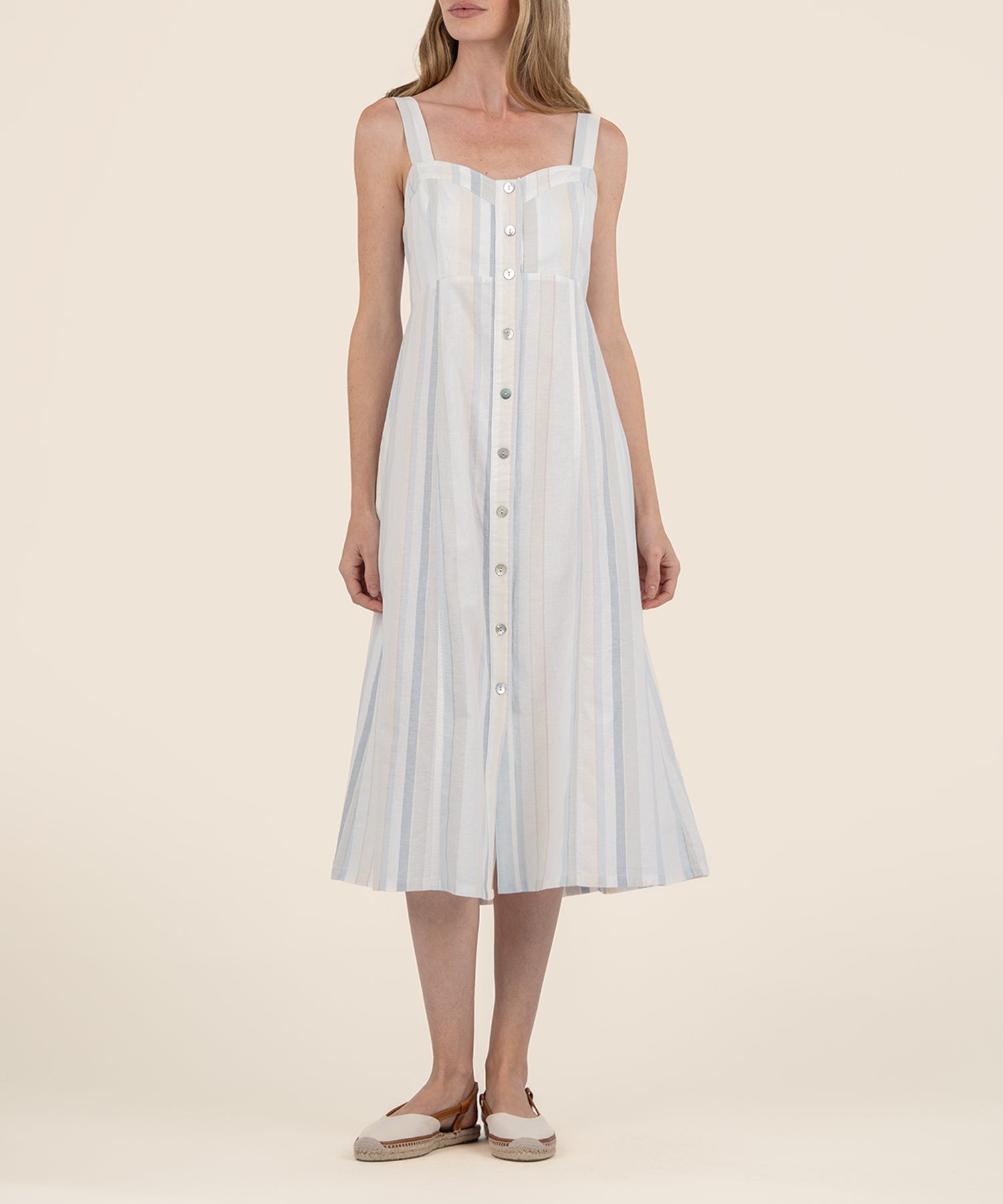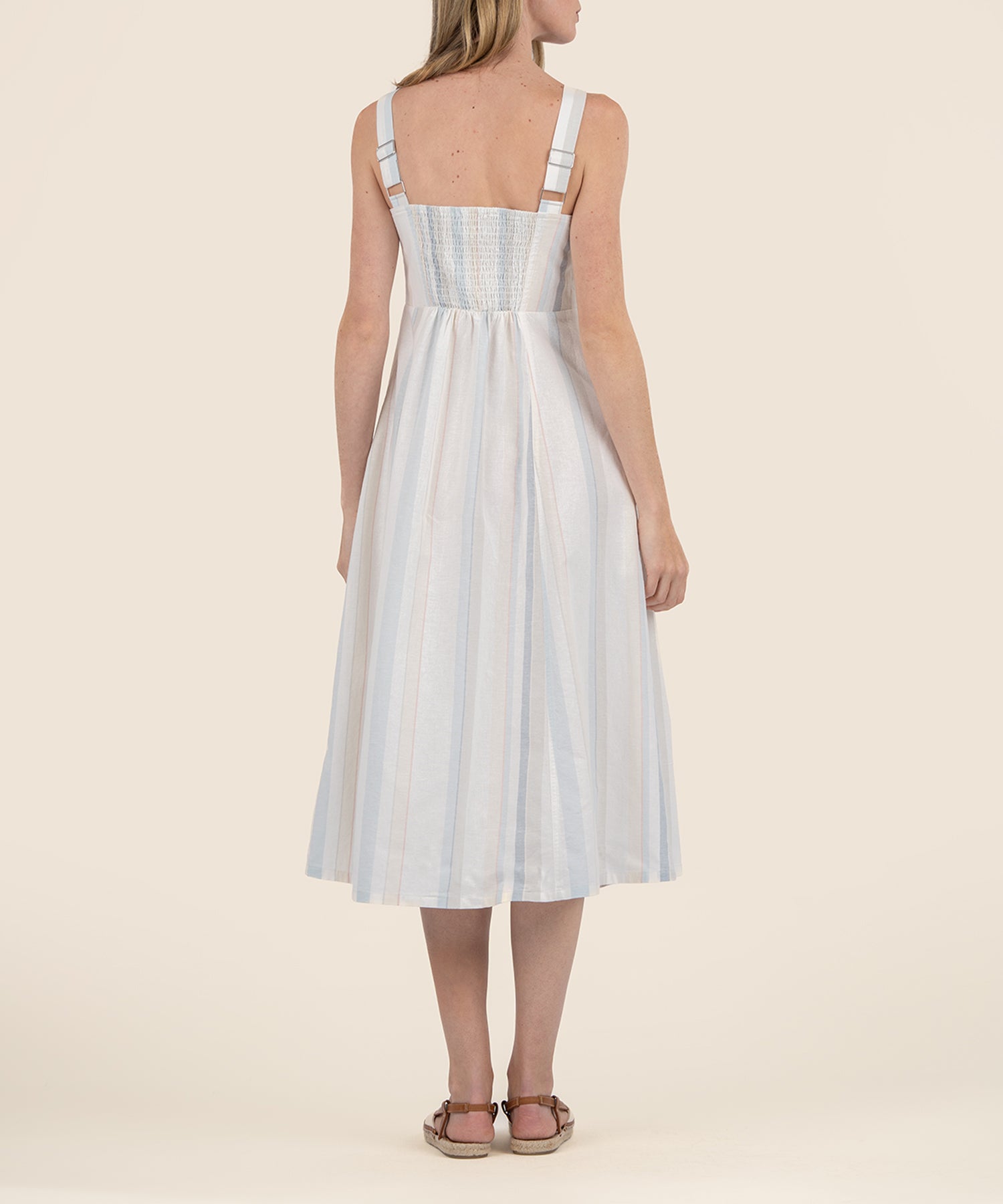 - This midi slip dress offers a sleek, effortless look with adjustable straps for a perfect fit. The smocked and elastic back ensures comfort and flexibility, while the side pockets add practicality to this stylish piece. Ideal for casual outings or dressing up.