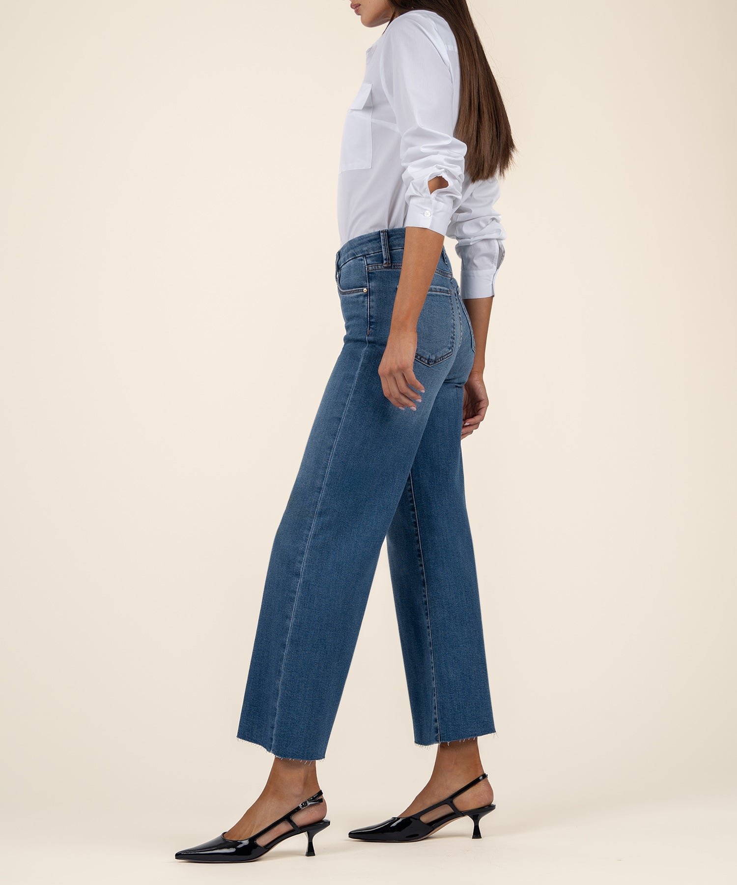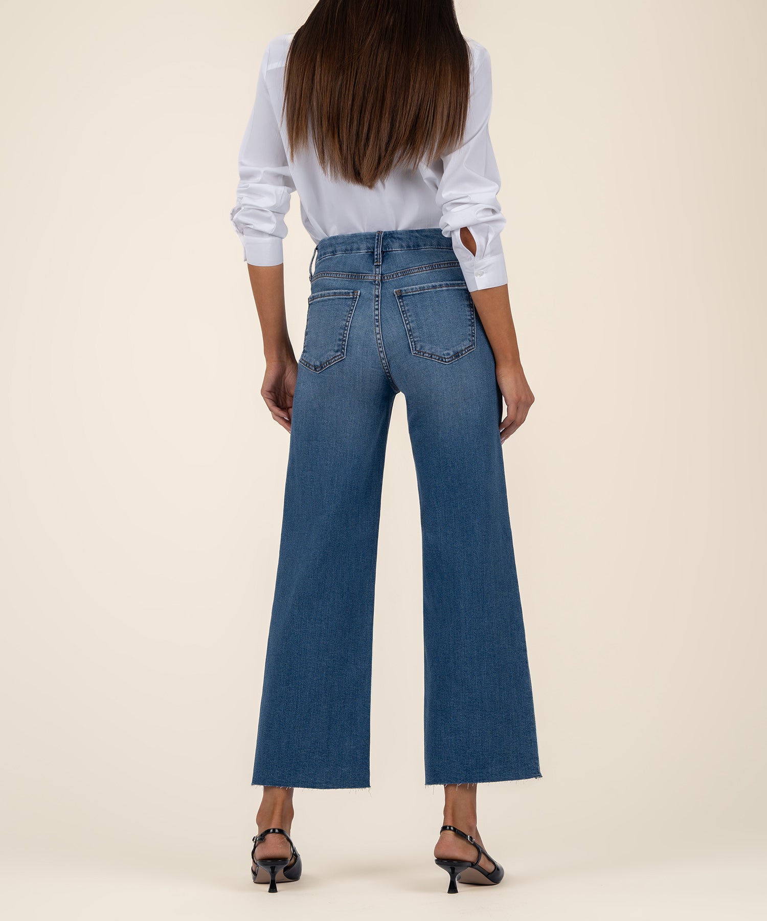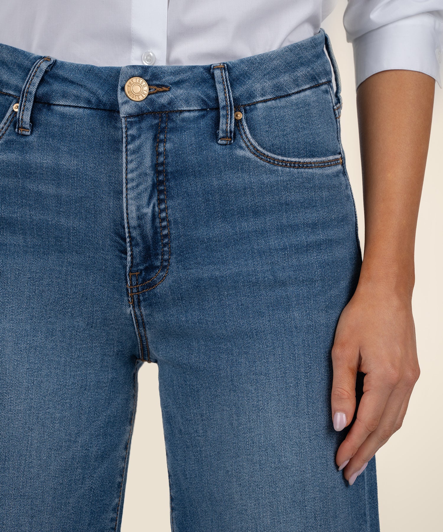 - Rock a throwback look in faded, high-rise wide-leg jeans featuring raw hems and Fab Ab front pockets that comfortably shape and slenderize.