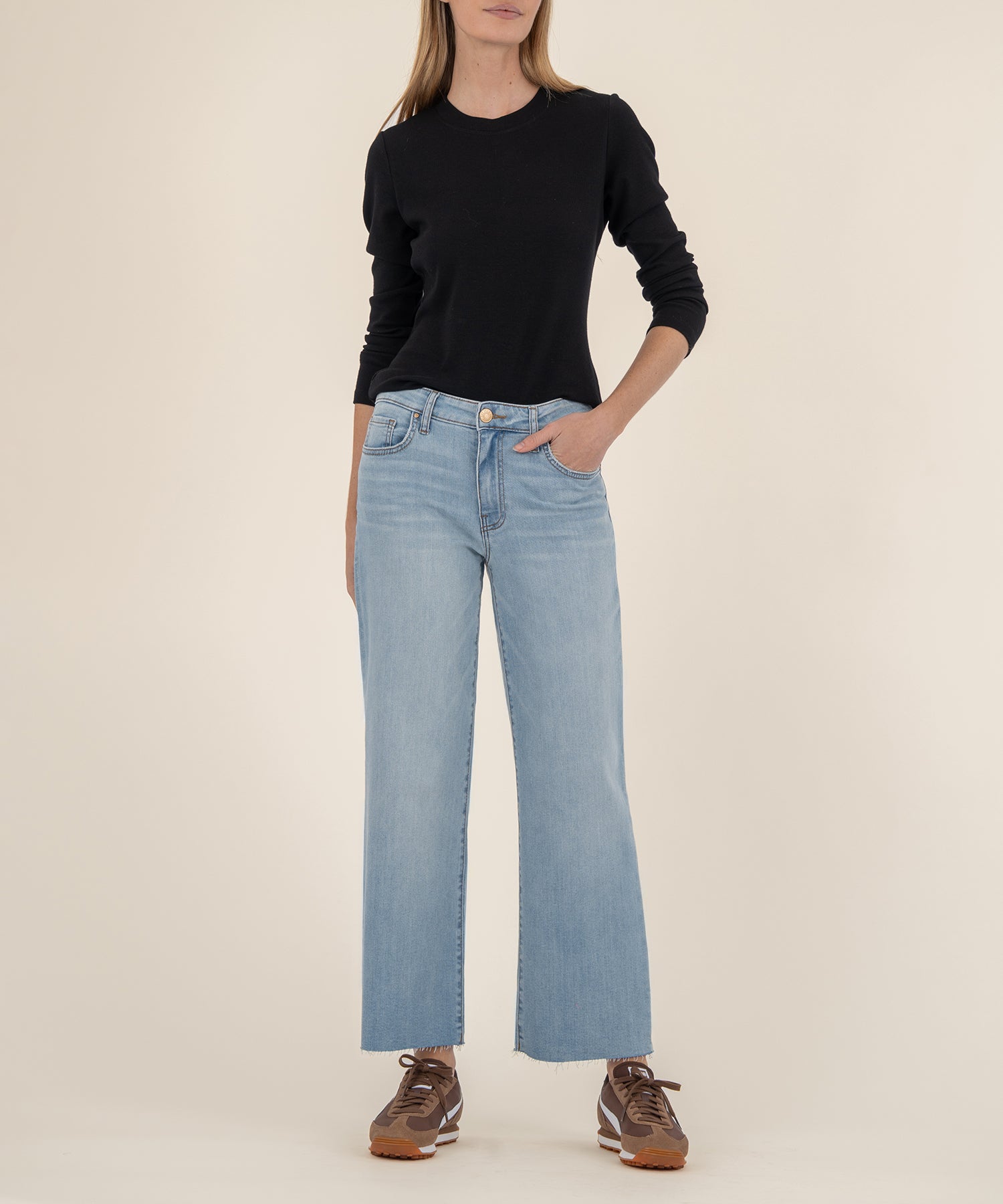 - These high-rise culottes in a light wash color offer a relaxed, modern fit. The raw hem adds an edgy finish, making them the perfect blend of casual comfort and style.