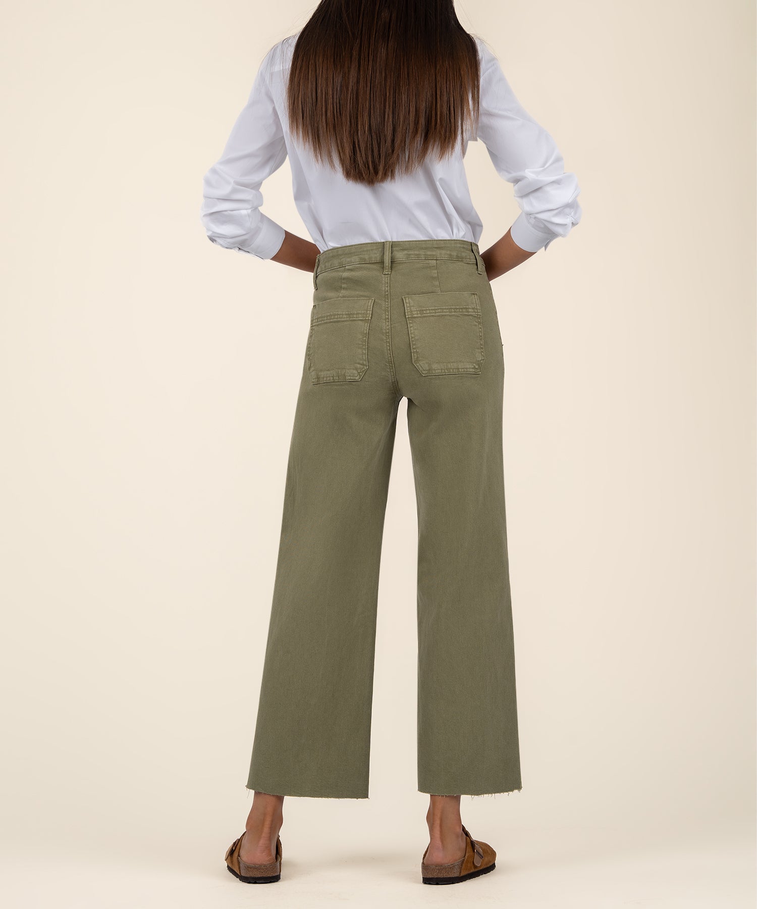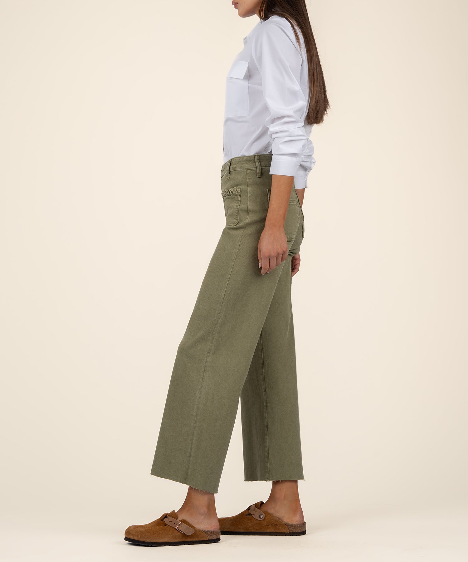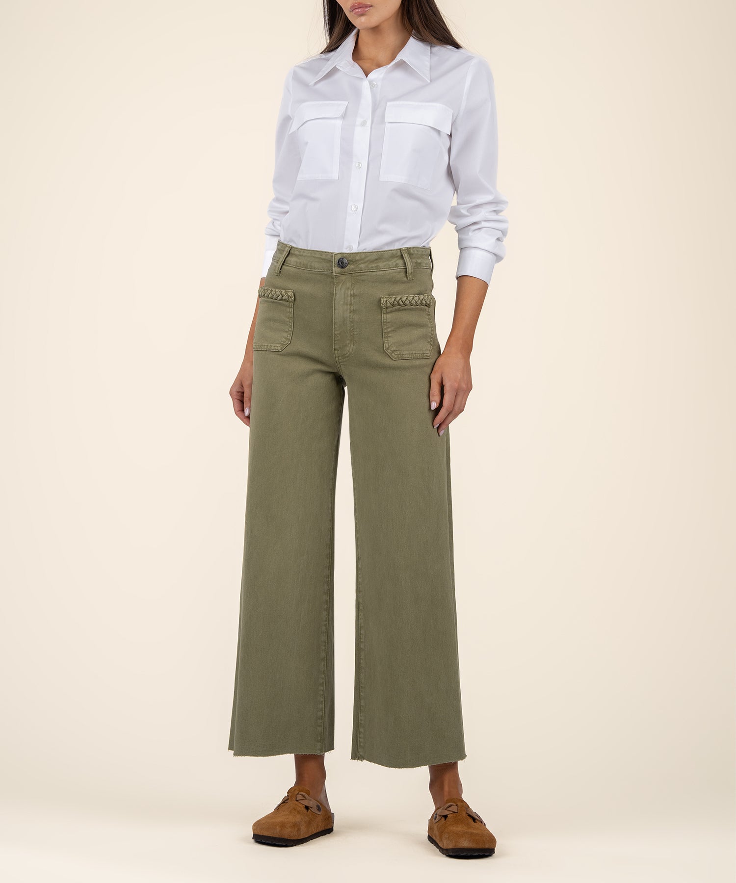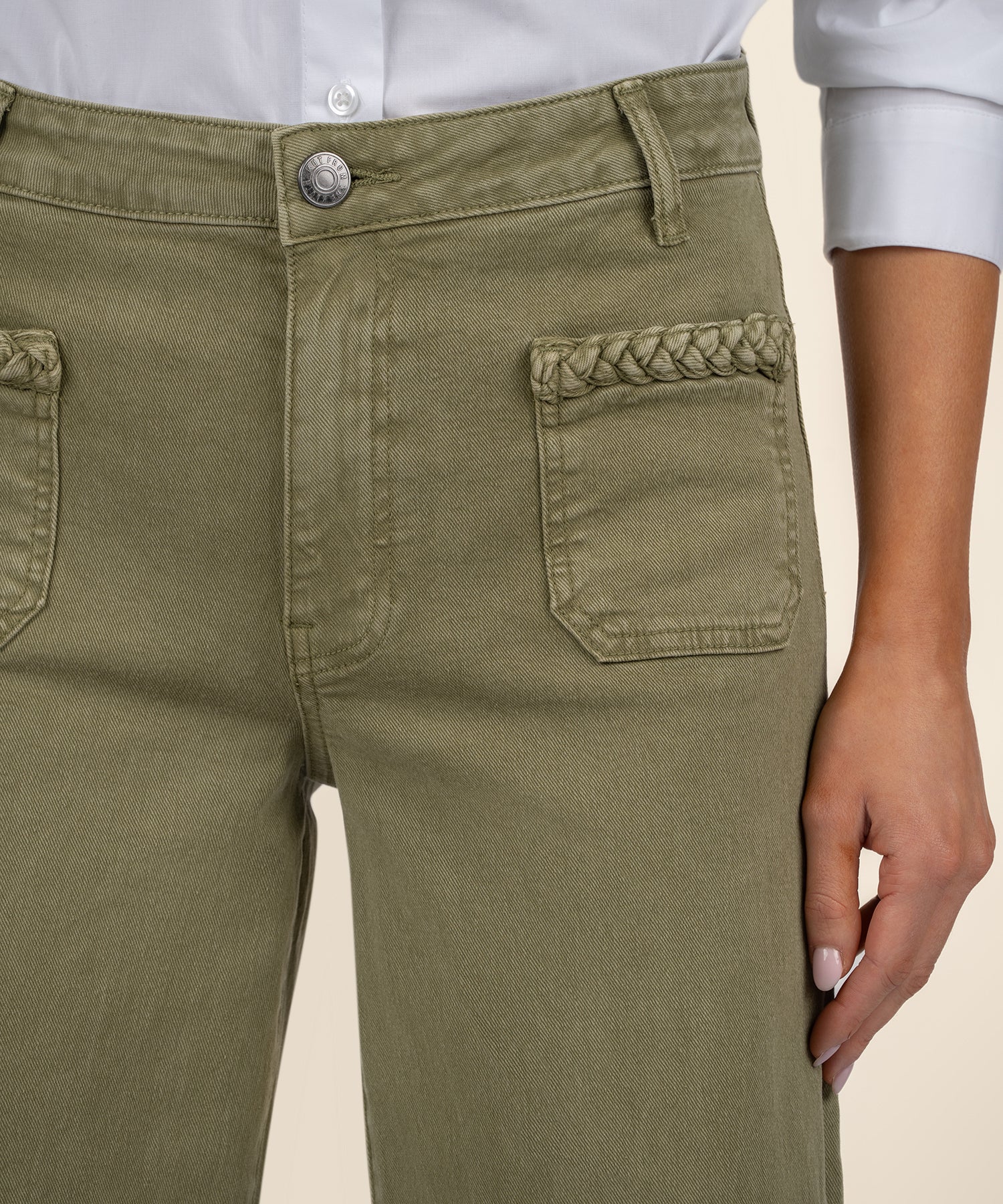 - Designed for style and comfort, these high-rise wide-leg pants offer a flattering silhouette while providing a relaxed fit. The front patch pockets are beautifully enhanced with unique braided detailing, adding a touch of texture and sophistication to the classic design.