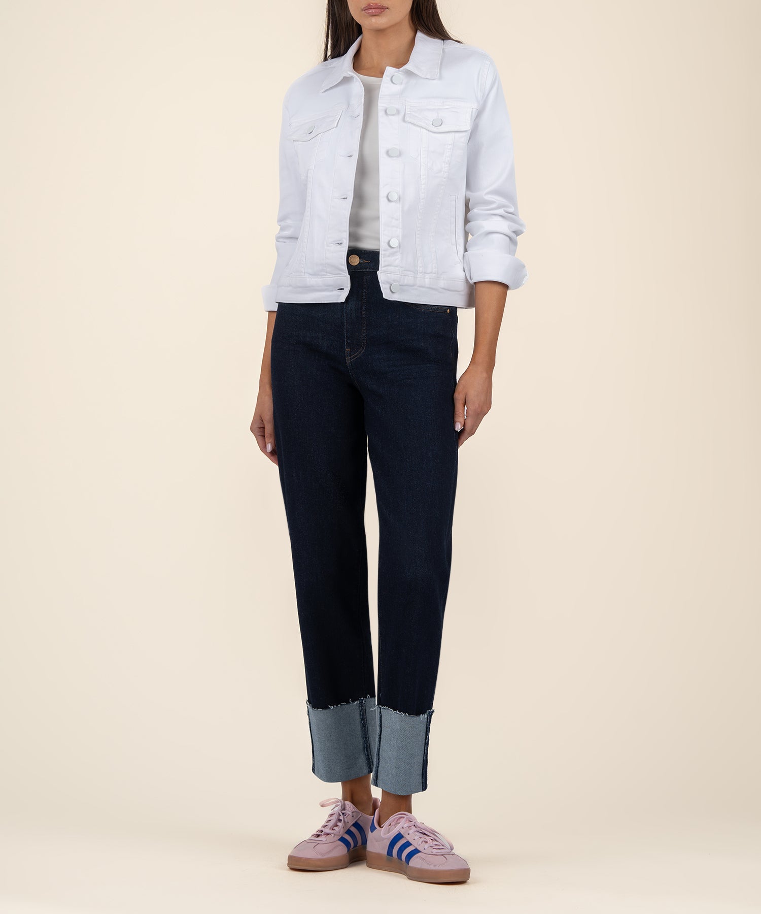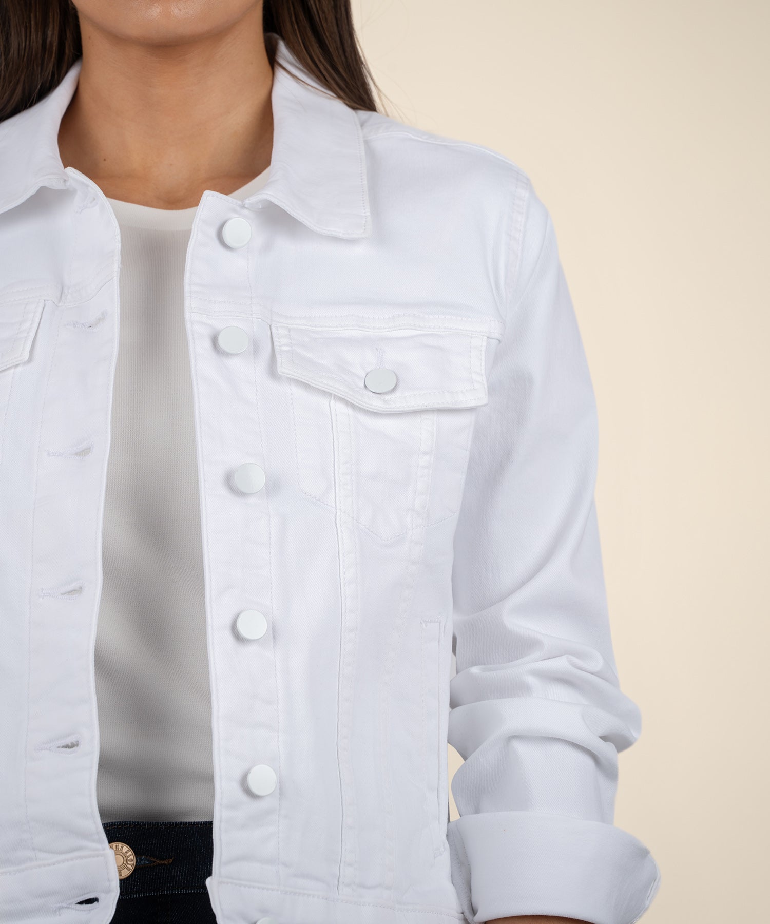 - This optic white jean jacket features a semi-fit design, offering a flattering shape with just the right amount of relaxed style for versatile, everyday wear.