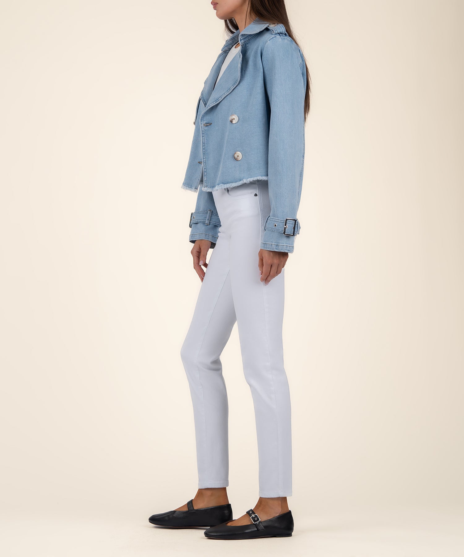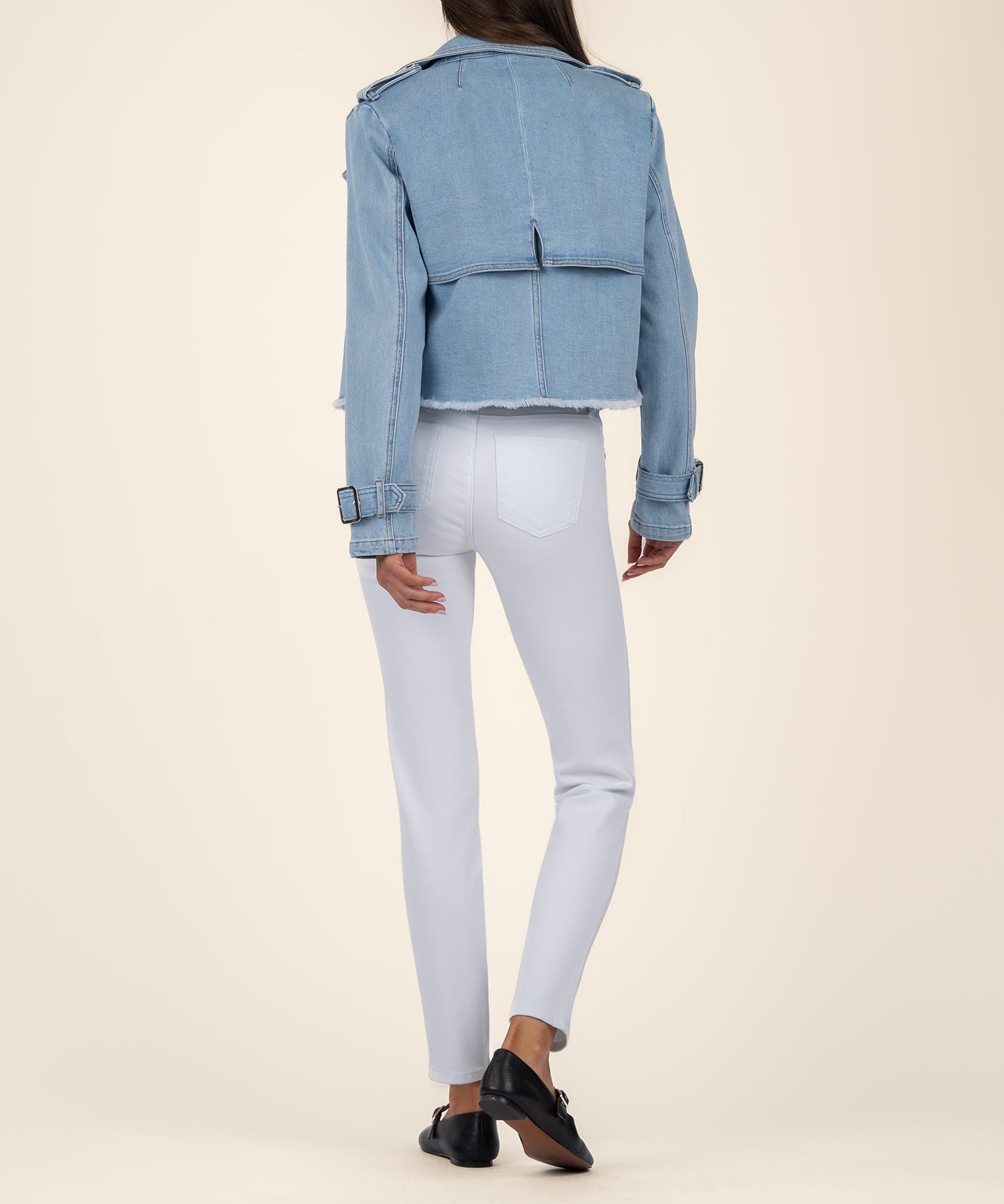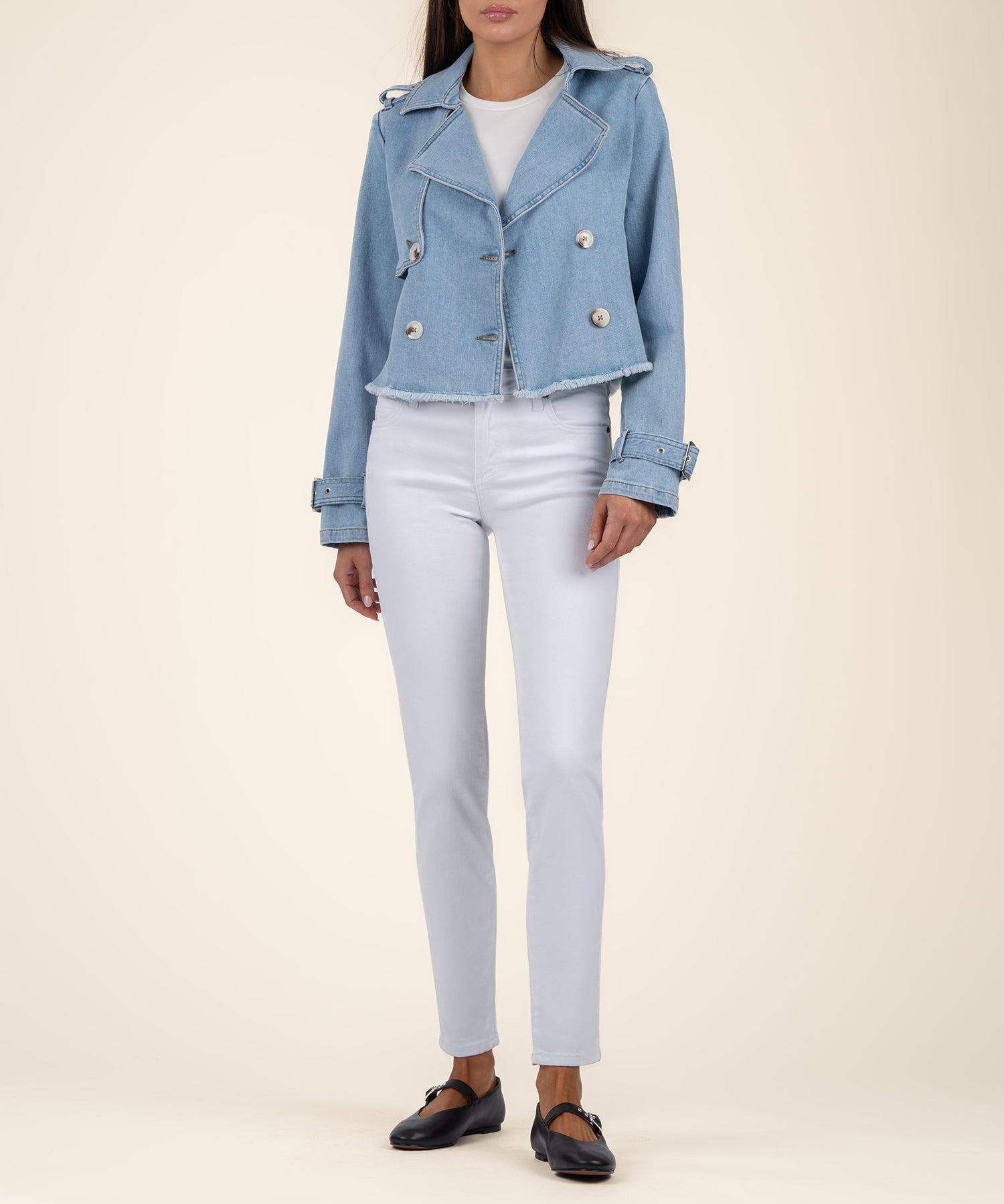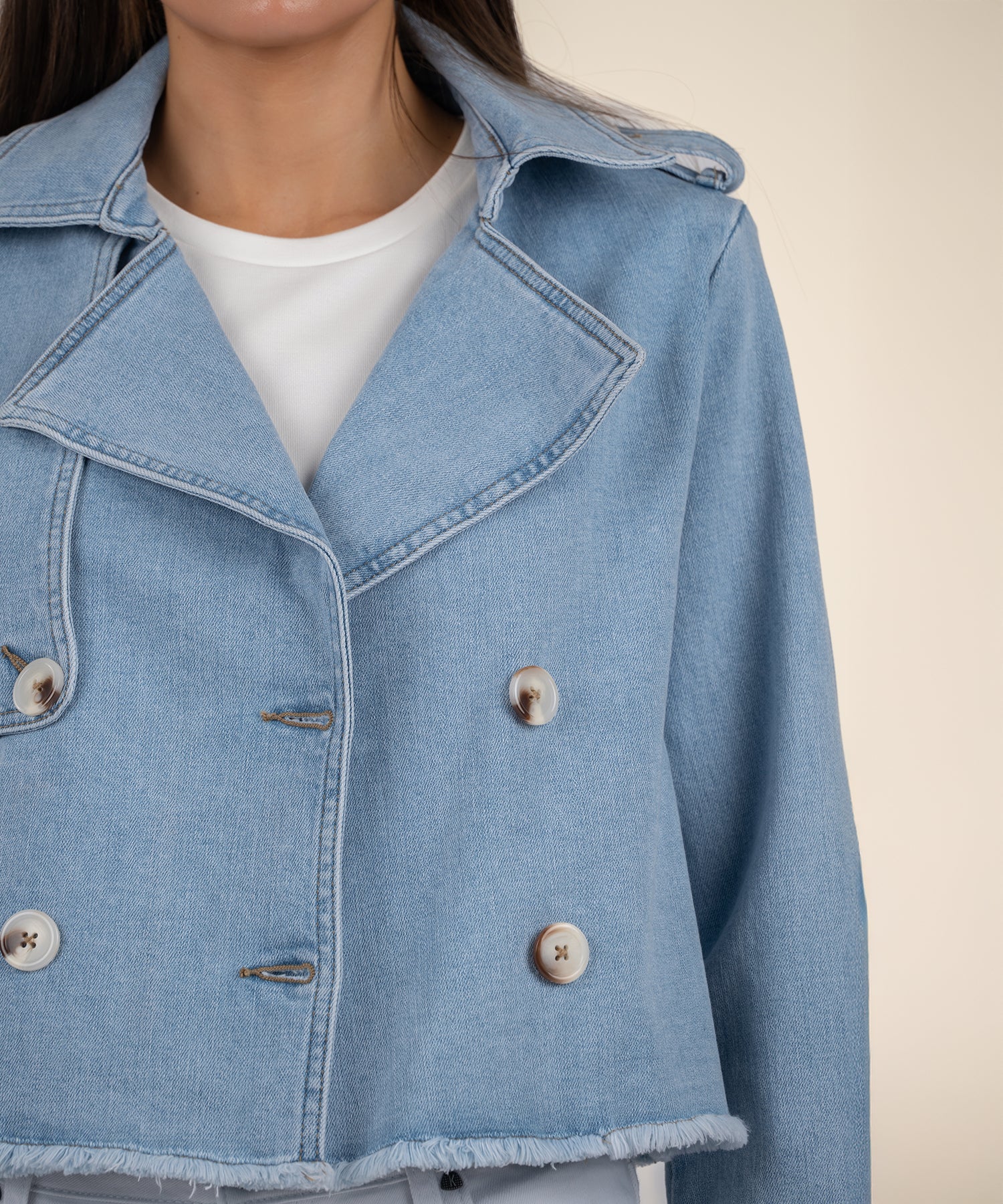 - This double-breasted crop jacket is designed with a stylish fray hem and belted cuffs for a unique look. The structured silhouette and distinctive details make it a bold statement piece, adding a touch of modern edge to any outfit.