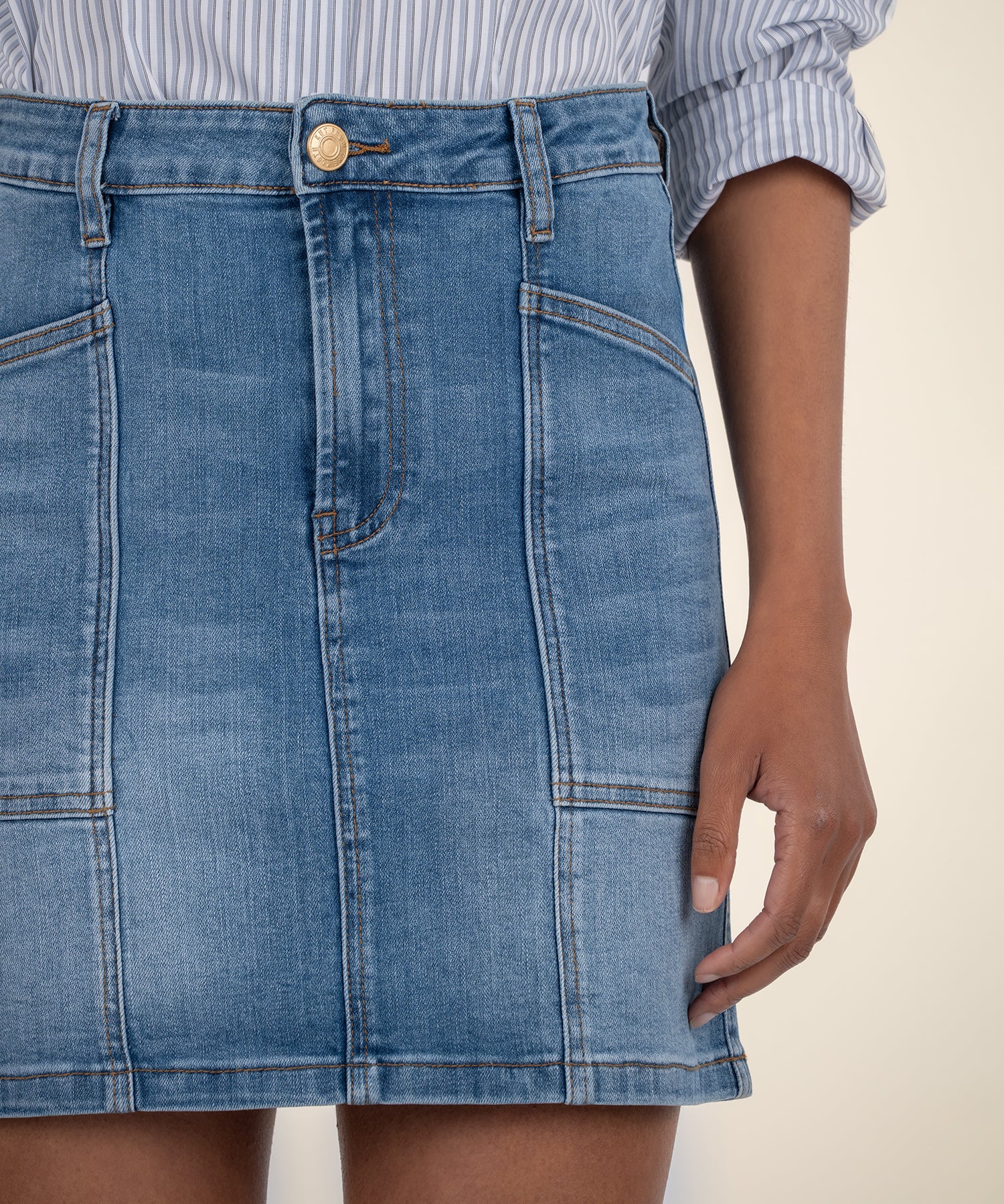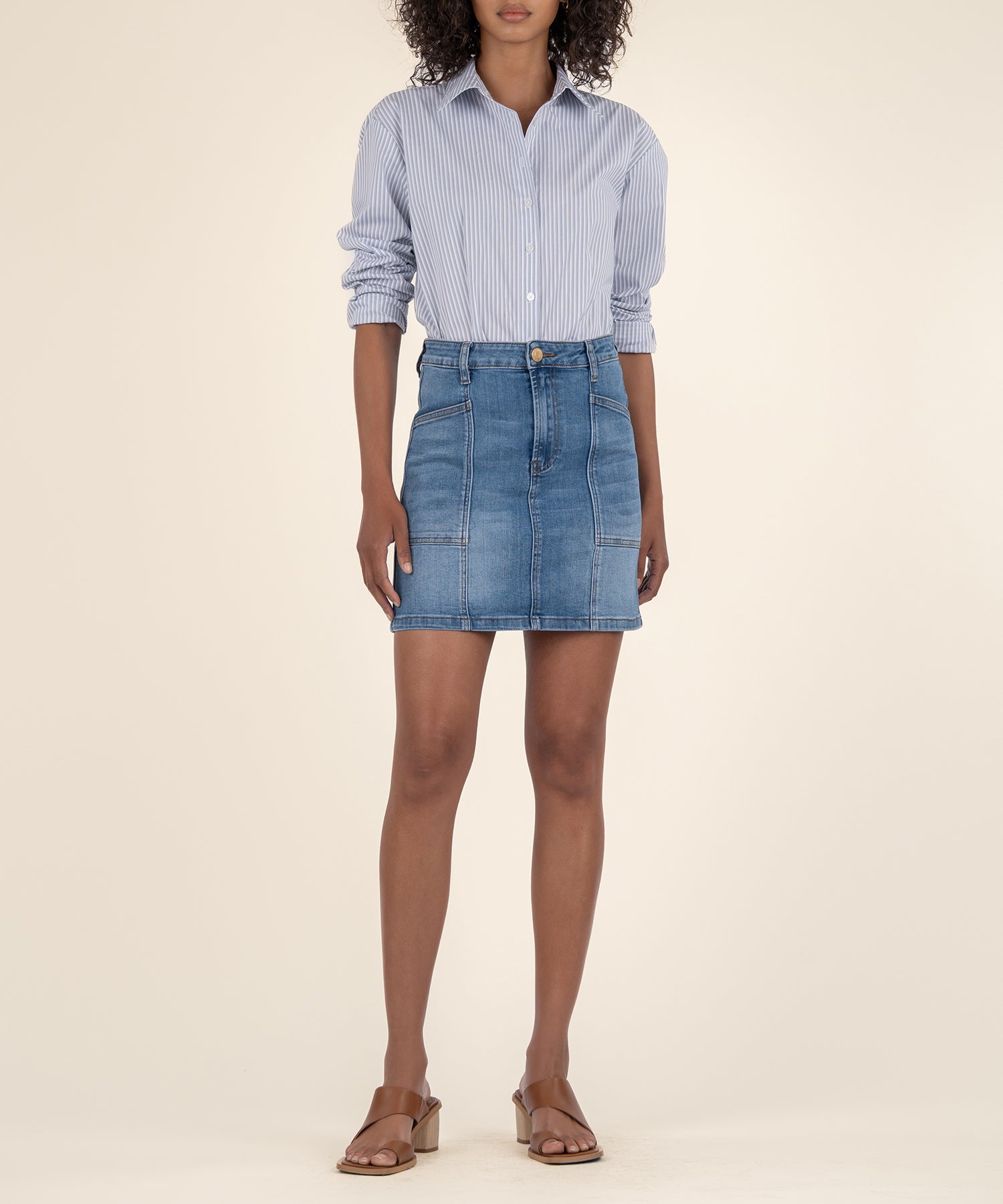 • This above-knee length skirt effortlessly combines style and functionality. With a chic front seam for a touch of flair and back slash patch pockets for added practicality, it’s the perfect mix of trendy and versatile. Whether paired with a casual tee or dressed up for a night out, this skirt offers a flattering fit that works for any occasion.