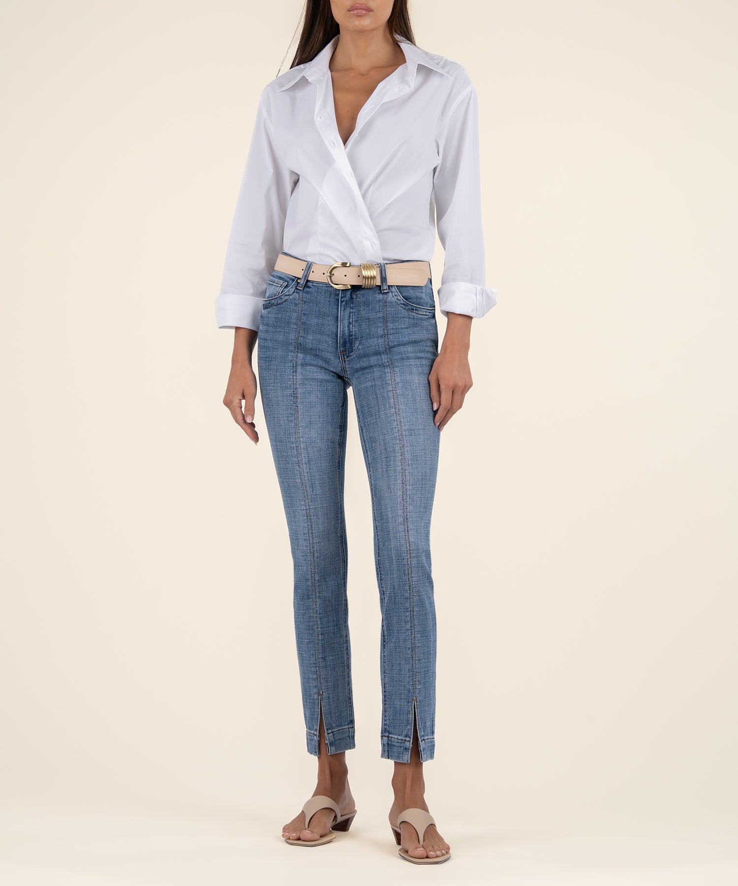 - This stylish pair of pants features a flattering straight leg design that offers a sleek and modern look. The princess seam at the front enhances the fit and shape, adding a touch of sophistication. With a subtle slit detail, these pants offer a unique twist on a classic silhouette, perfect for both casual and dressed-up occasions.