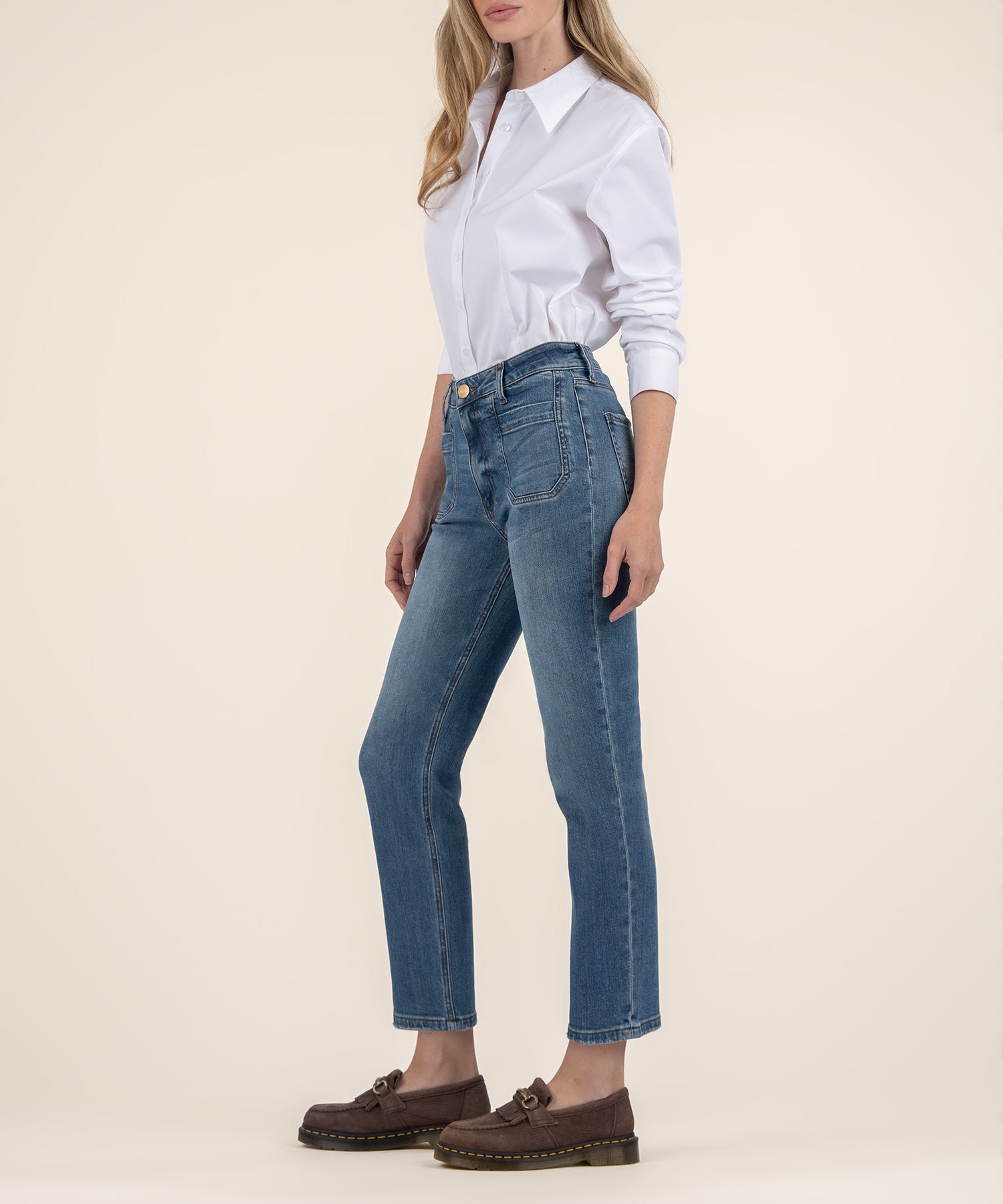 - With a vintage-inspired vibe, these stretchy, slim-cut jeans feature a flattering medium wash and front inset pockets that gently shape and smooth for a comfortable, streamlined fit.