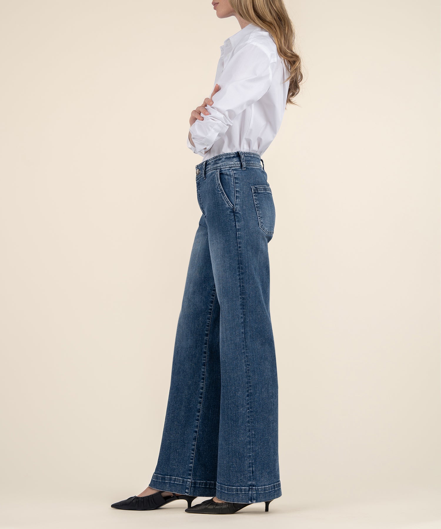 - Designed with a high-rise fit and wide-leg silhouette, these jeans feature stylish slash front pockets, blending effortless comfort with a modern edge.
