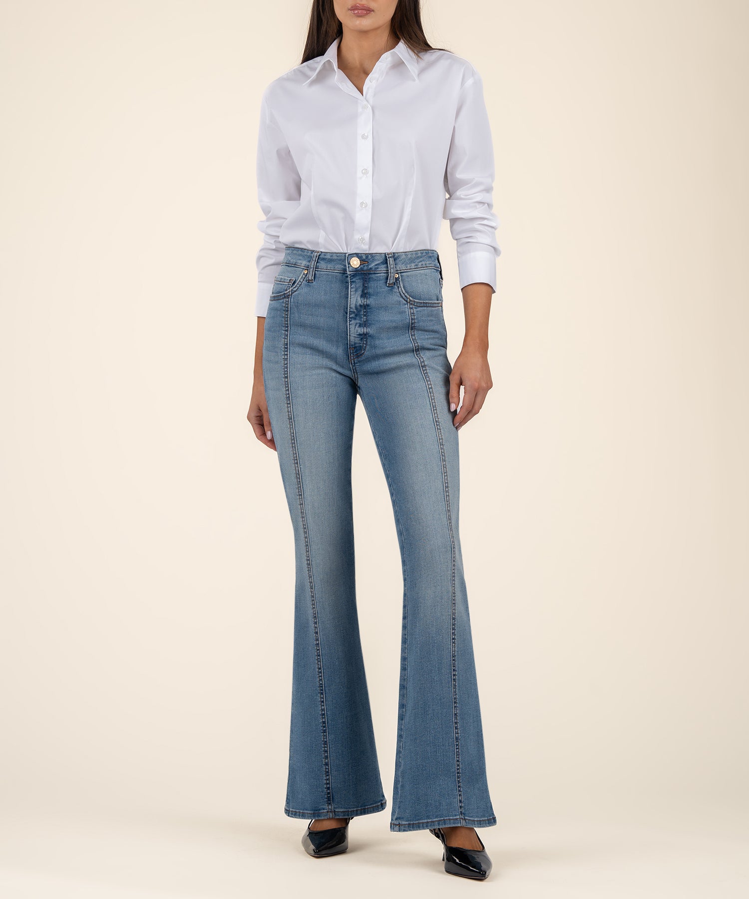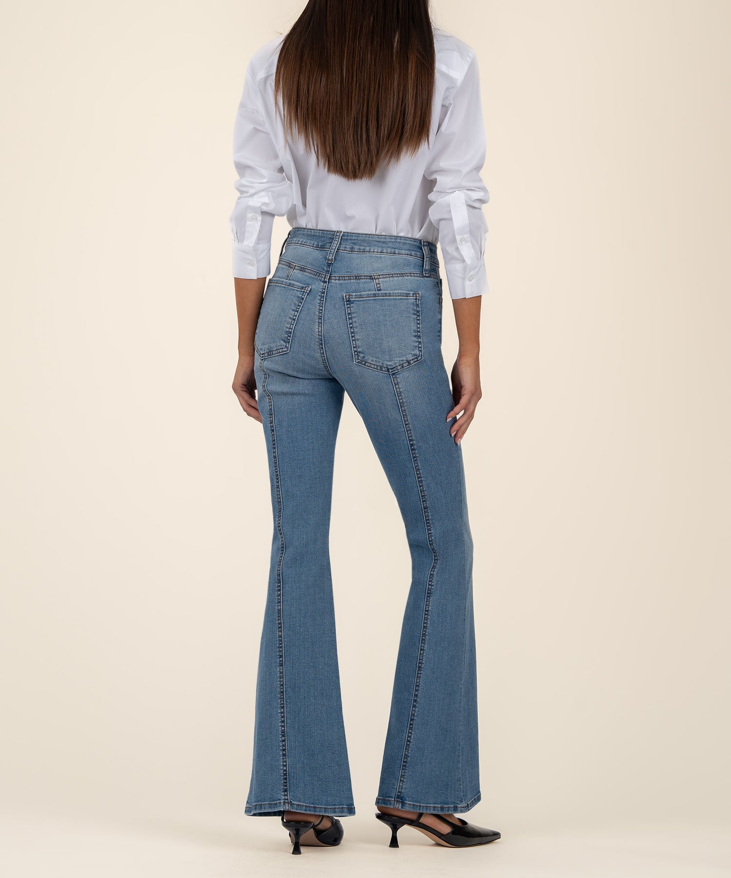 - The bold super flare leg with high rise and Fab Ab pockets adds a dramatic touch, while the front and back seam details enhance the silhouette for a sleek, polished look. Perfect for both casual and dressy occasions.