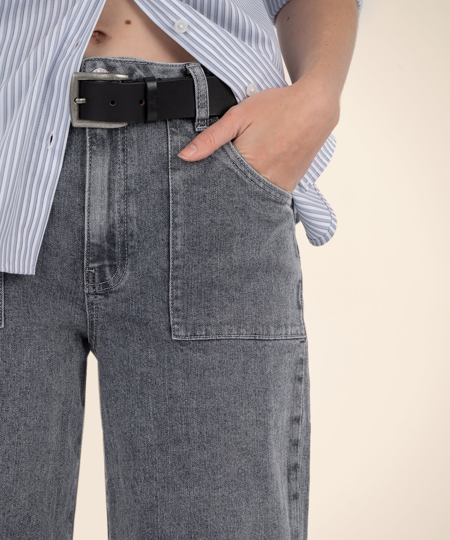 - These high-rise jeans feature a wide barrel-leg silhouette that adds a fresh shape to your denim lineup. Designed in a versatile grey wash, they\'re finished with classic pork chop pockets for a subtle utility-inspired touch.