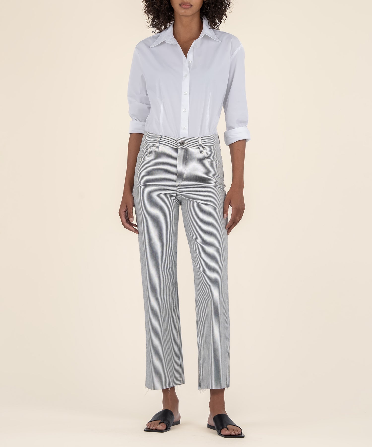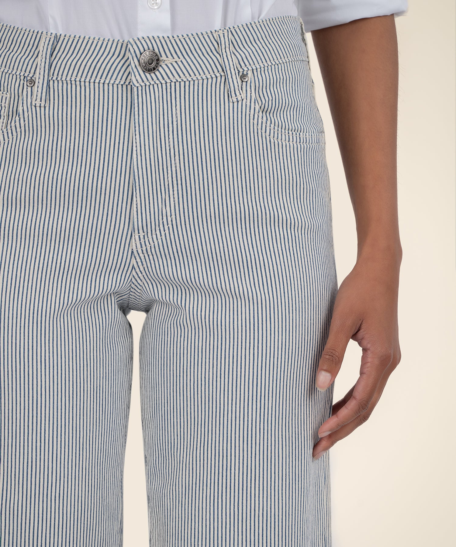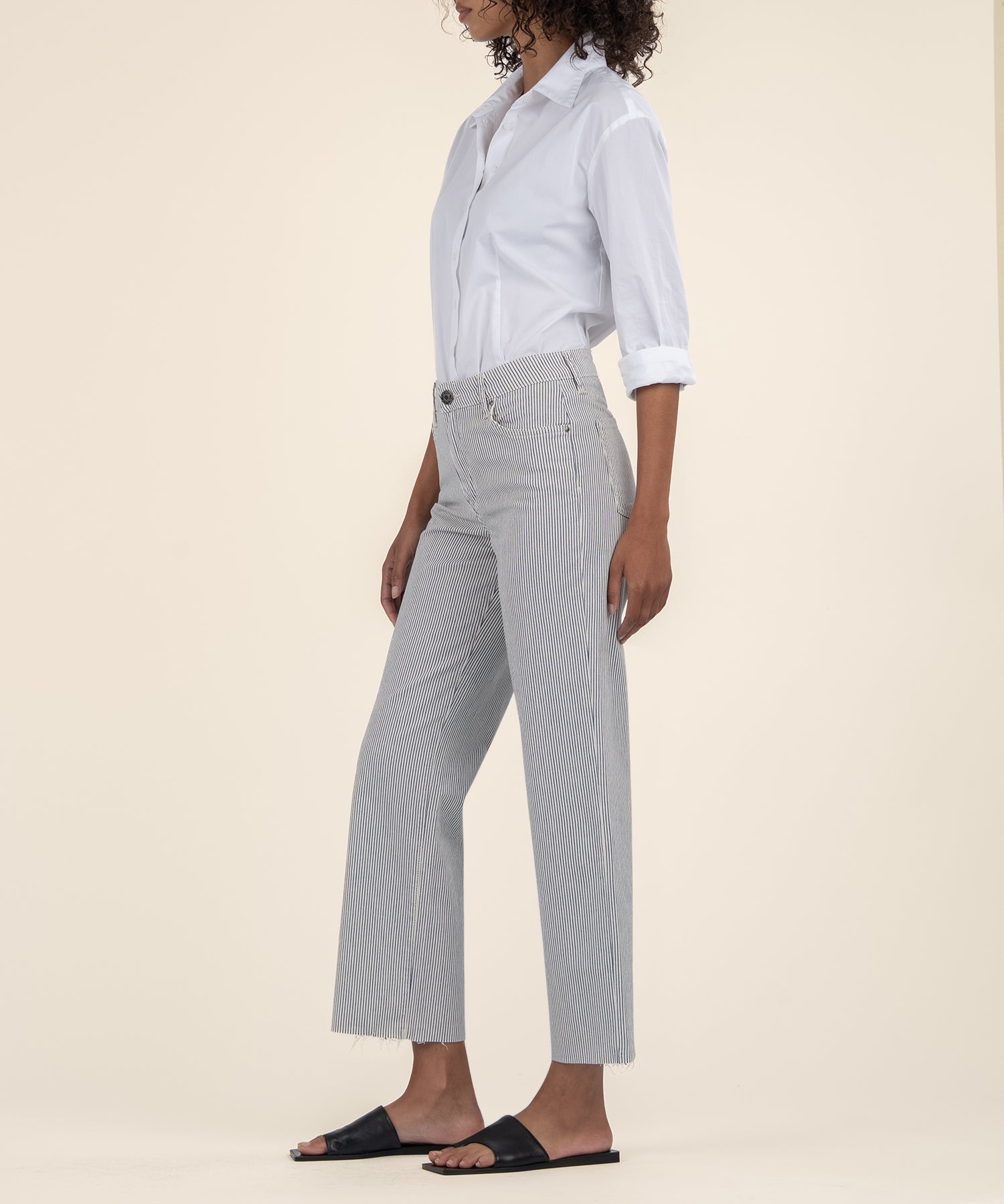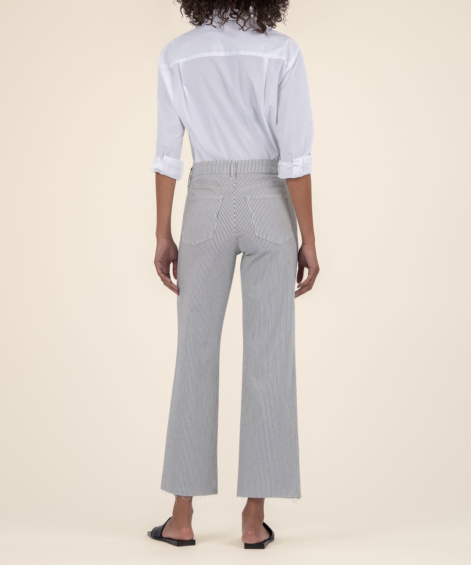 - These high rise wide leg pants combine a flattering high-rise fit with a flowy, relaxed silhouette. The bold railroad stripe pattern and raw hem detail add a modern, edgy touch.