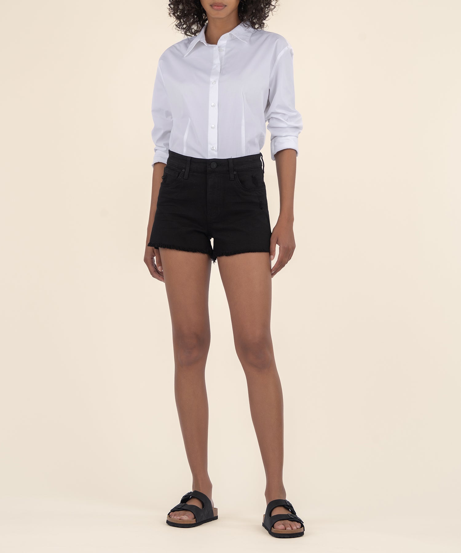 • A true high rise, relaxed fit short will soon become a wardrobe staple. The destruction throughout, along with a frayed hem give off a vintage style. This pair will stretch to comfort without losing their shape.High Rise