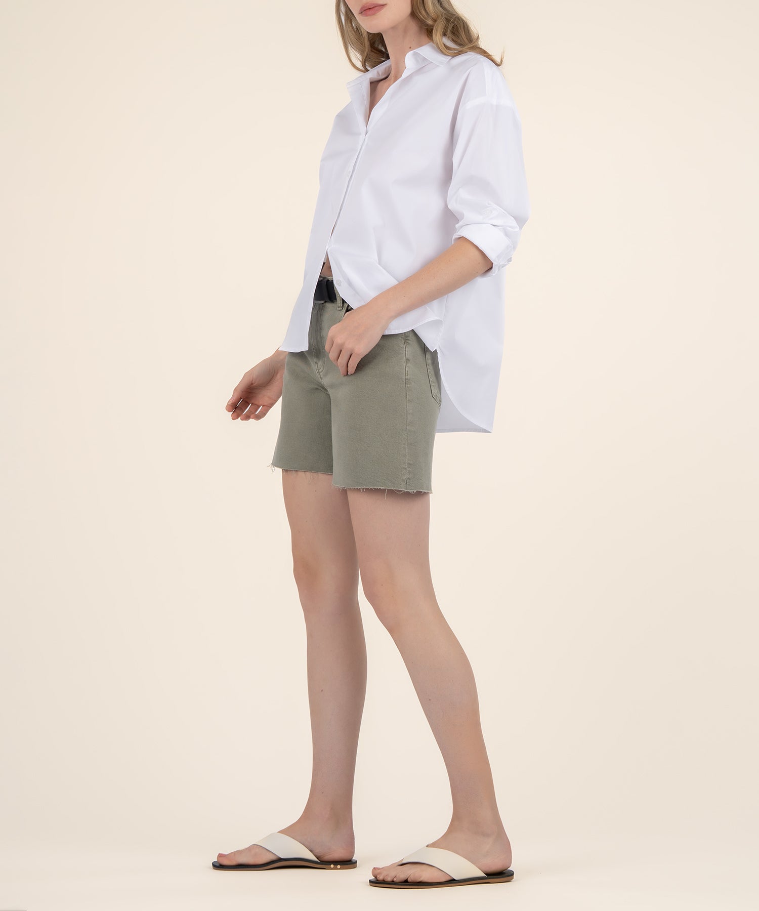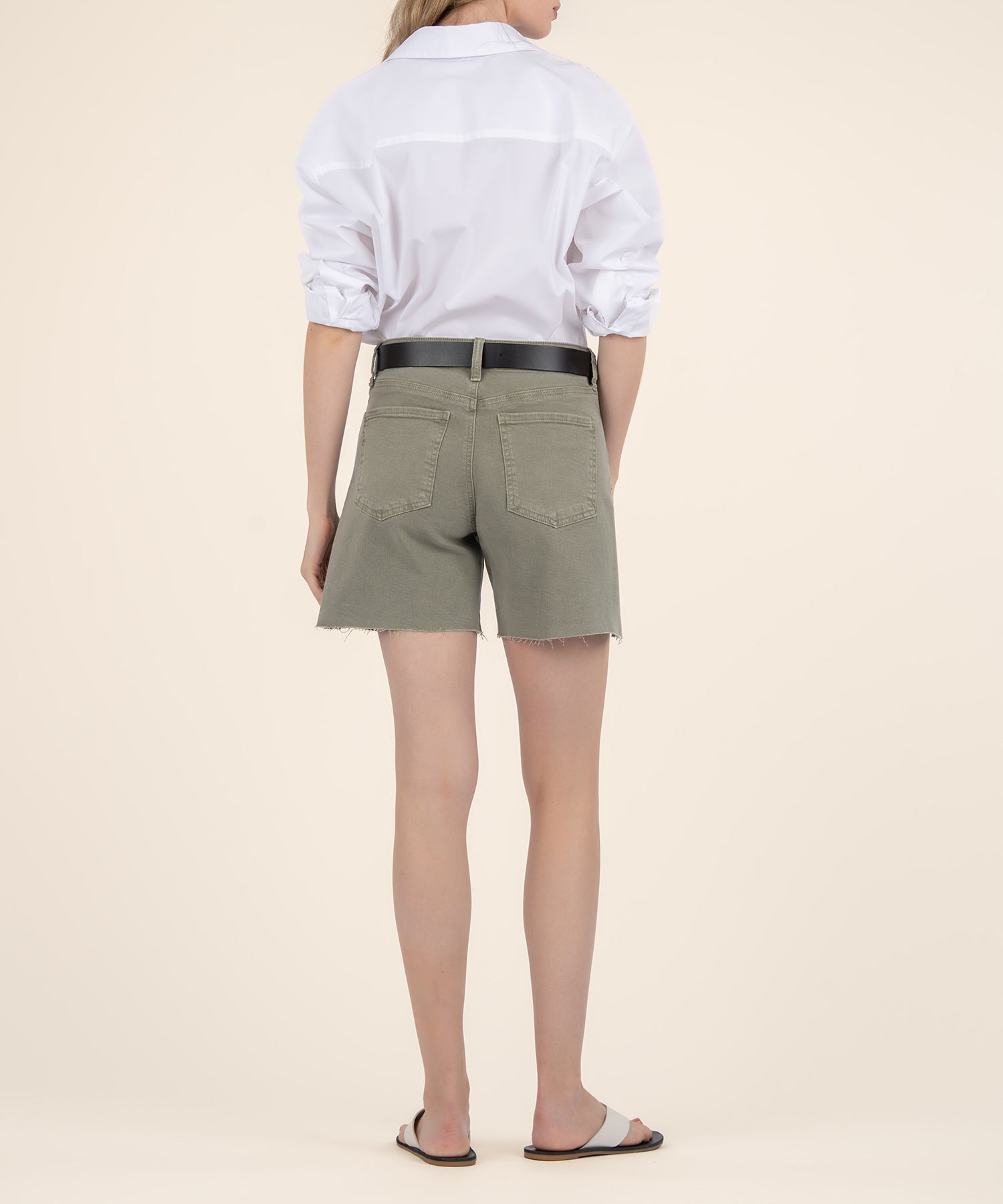 - These high rise shorts in a rich dark sage color offer a sleek, modern look. The raw hem adds a casual, edgy touch, making them perfect for warmer weather. With their timeless design, these shorts bring both style and comfort to your wardrobe.
