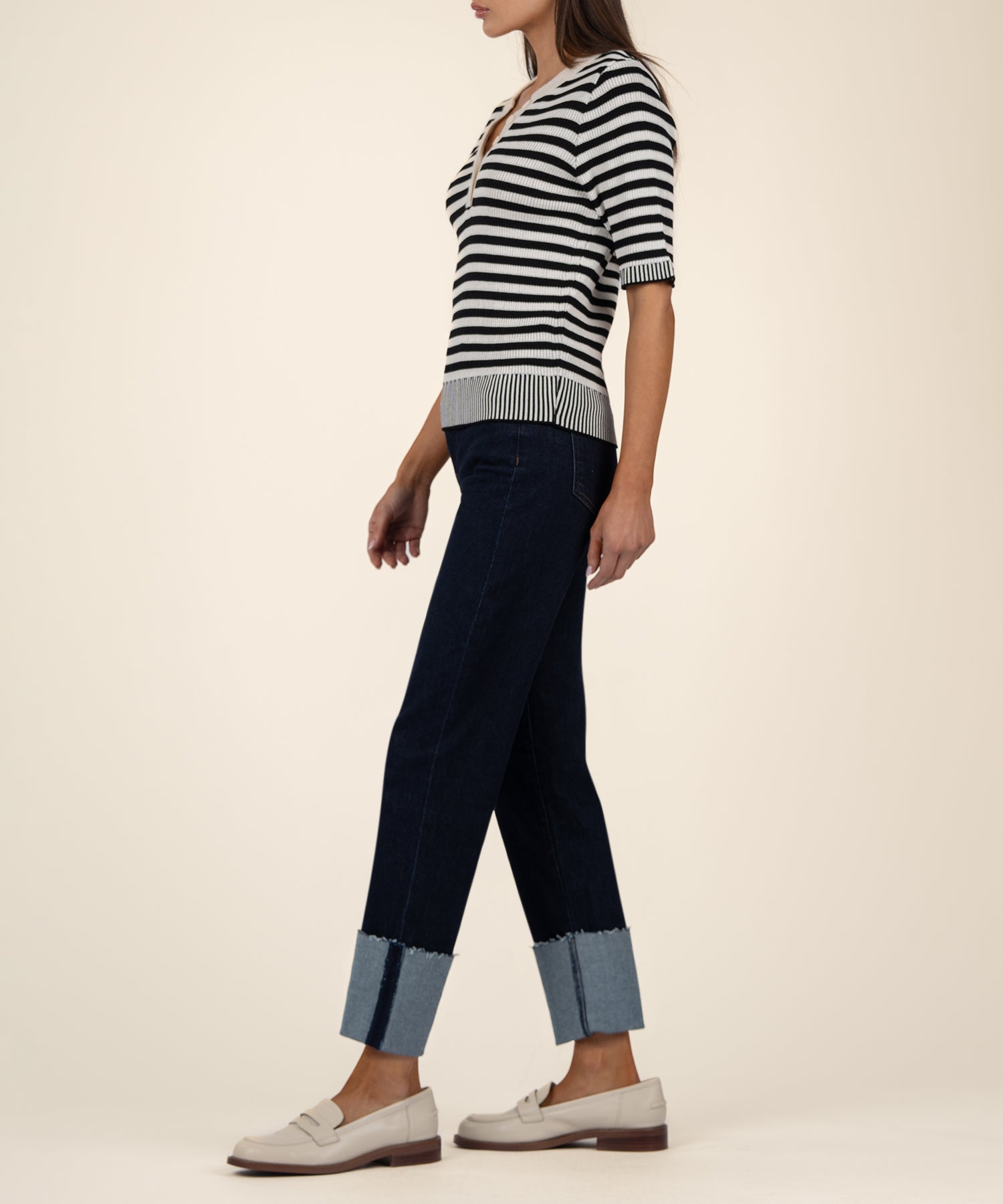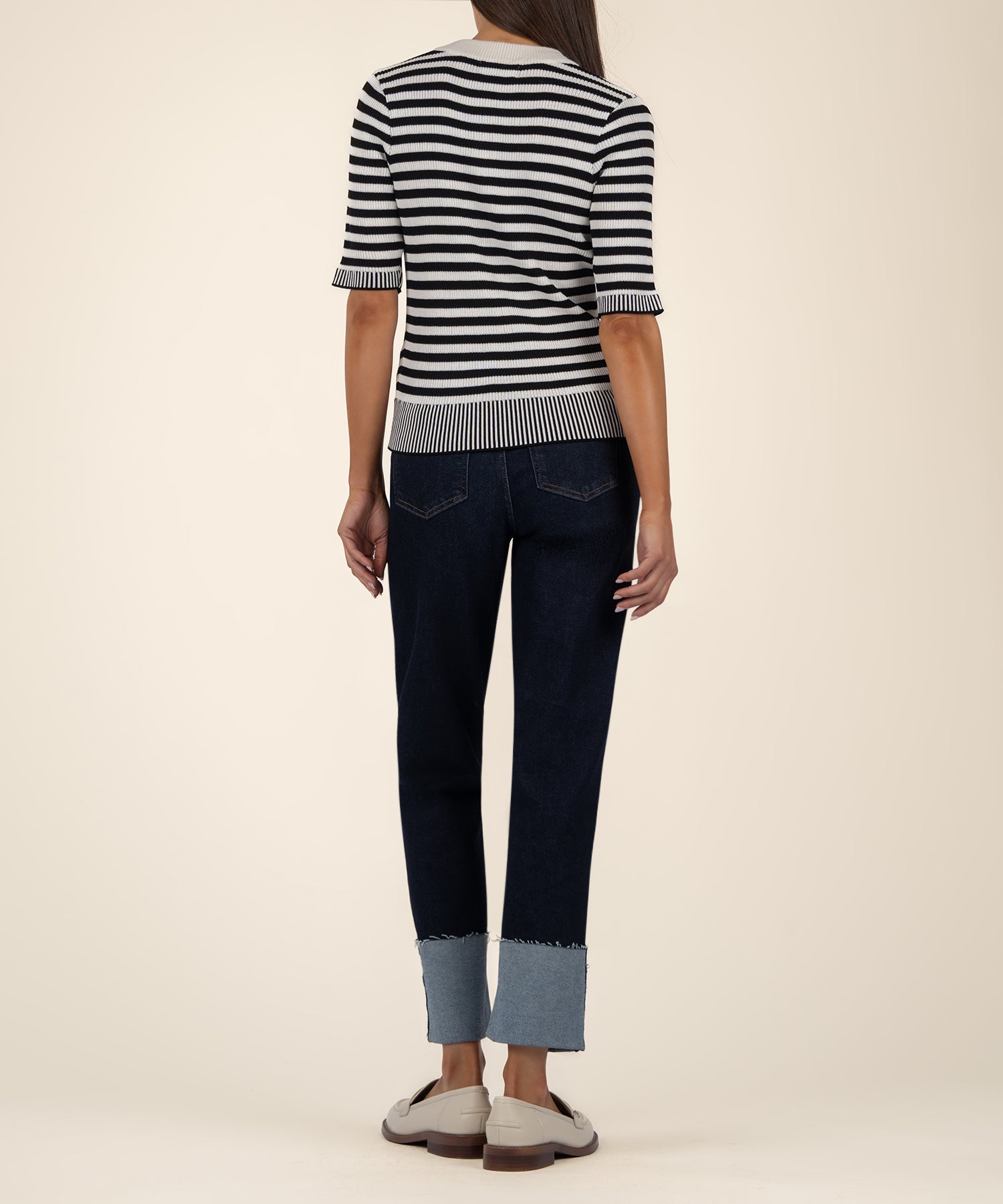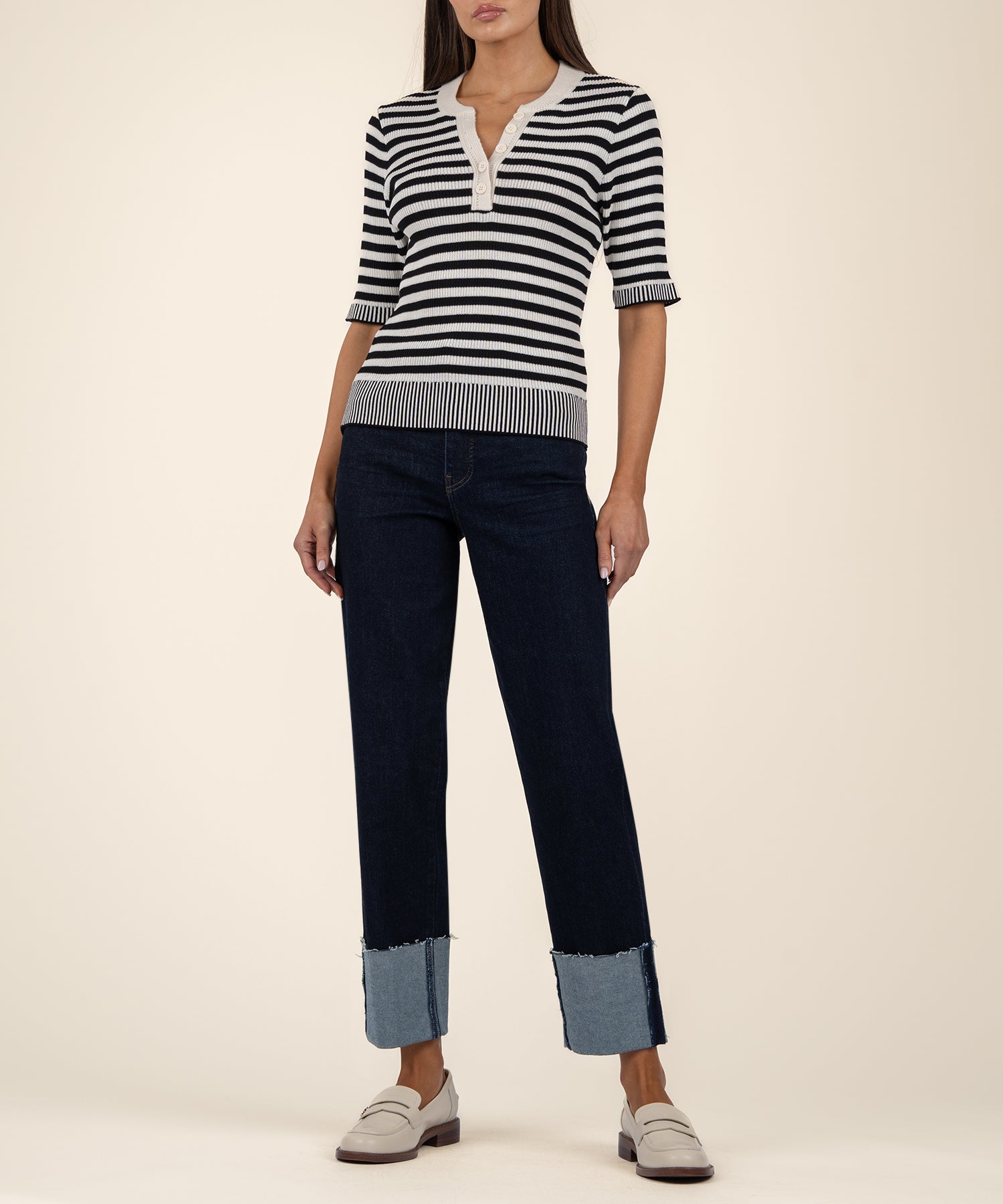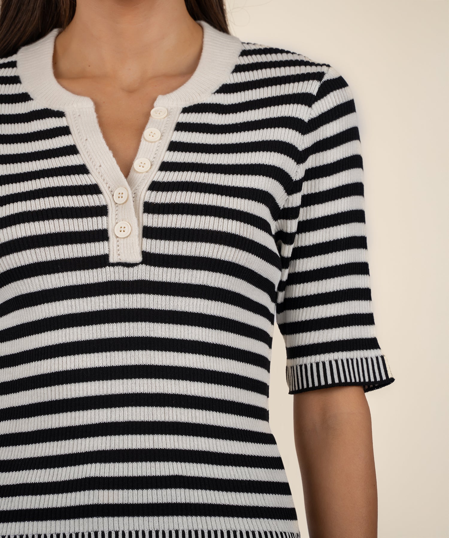 - This pull-over knit top with a classic henley neck is featuring short sleeves and a half button-down design, this black and white striped top is perfect for layering or wearing on its own.