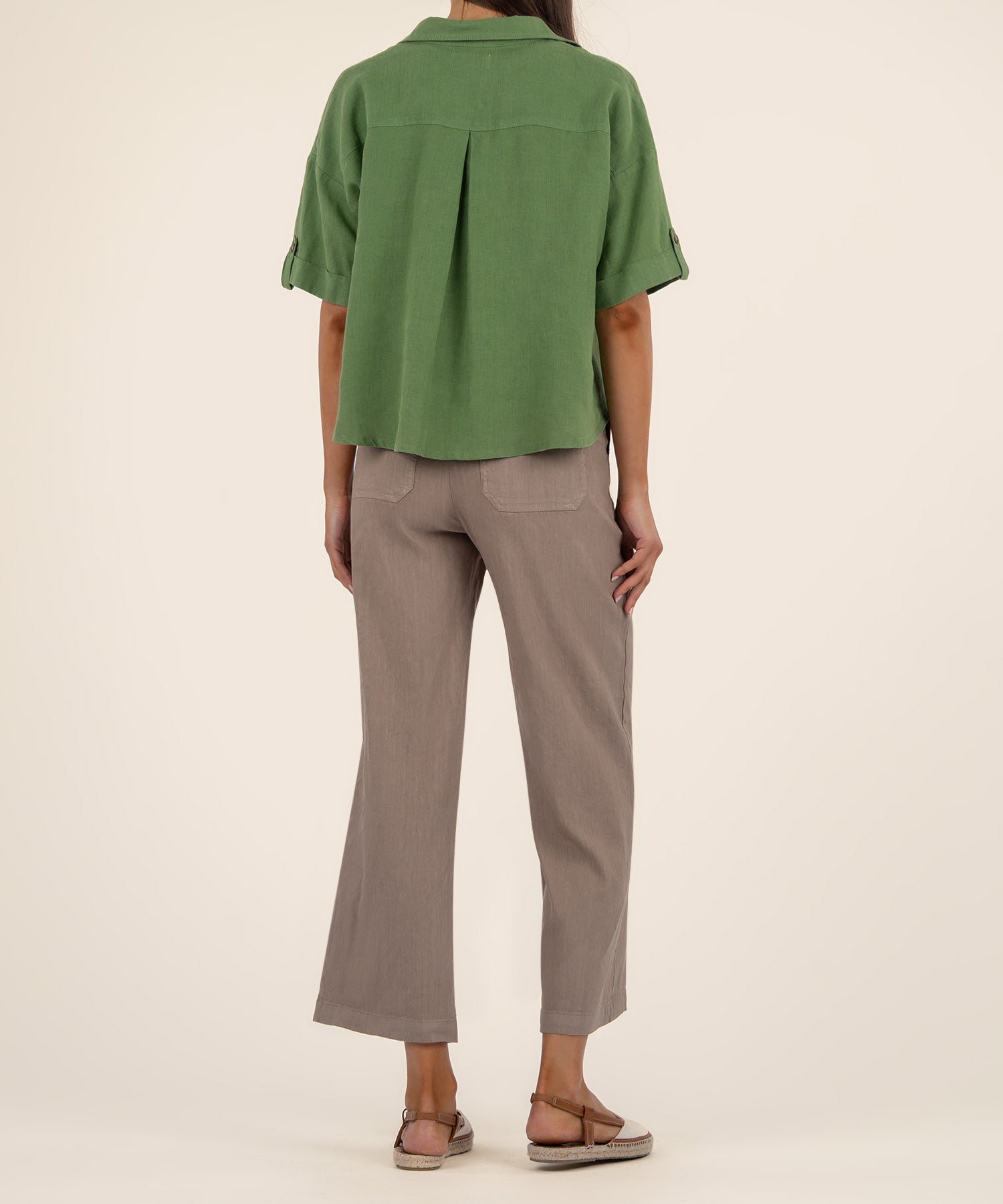 - This boxy top features a button-front design, short sleeves, and functional front pockets. Its relaxed fit and simple details make it a versatile wardrobe staple.