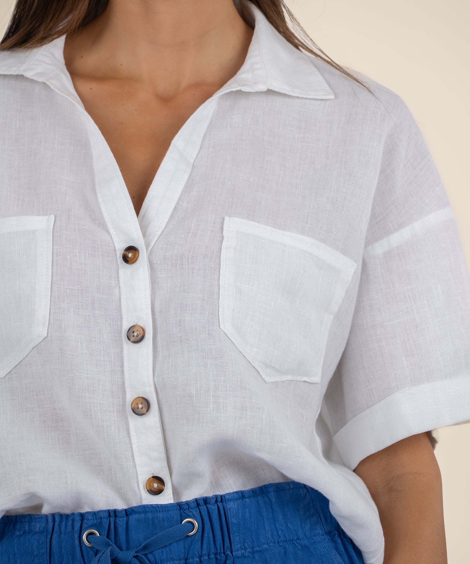 - This boxy top features a button-front design, short sleeves, and functional front pockets. Its relaxed fit and simple details make it a versatile wardrobe staple.