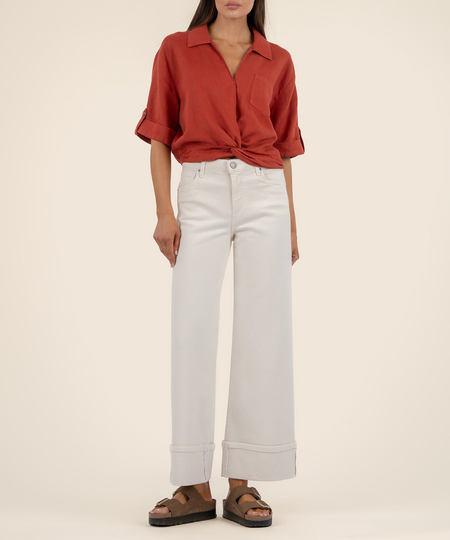 - This top is made from breathable linen mixed material that keeps you comfortable all day. Featuring stylish cuffed sleeves and a trendy knot front shirt design, it adds a fashionable touch to any outfit. Perfect for casual days with effortless style.