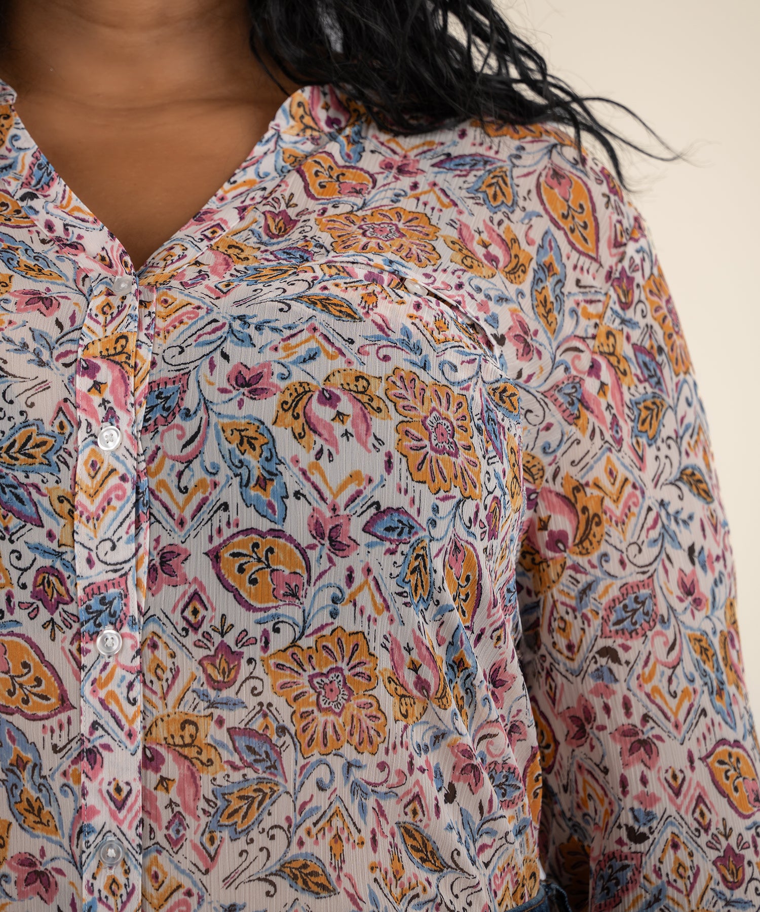 - Brimming with sheer charm, this bloom-print blouse is cut from flowy chiffon for an airy, lighthearted vibe.
