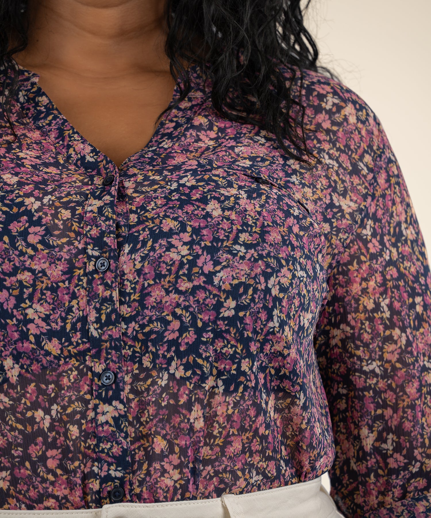 - Brimming with sheer charm, this bloom-print blouse is cut from flowy chiffon for an airy, lighthearted vibe.