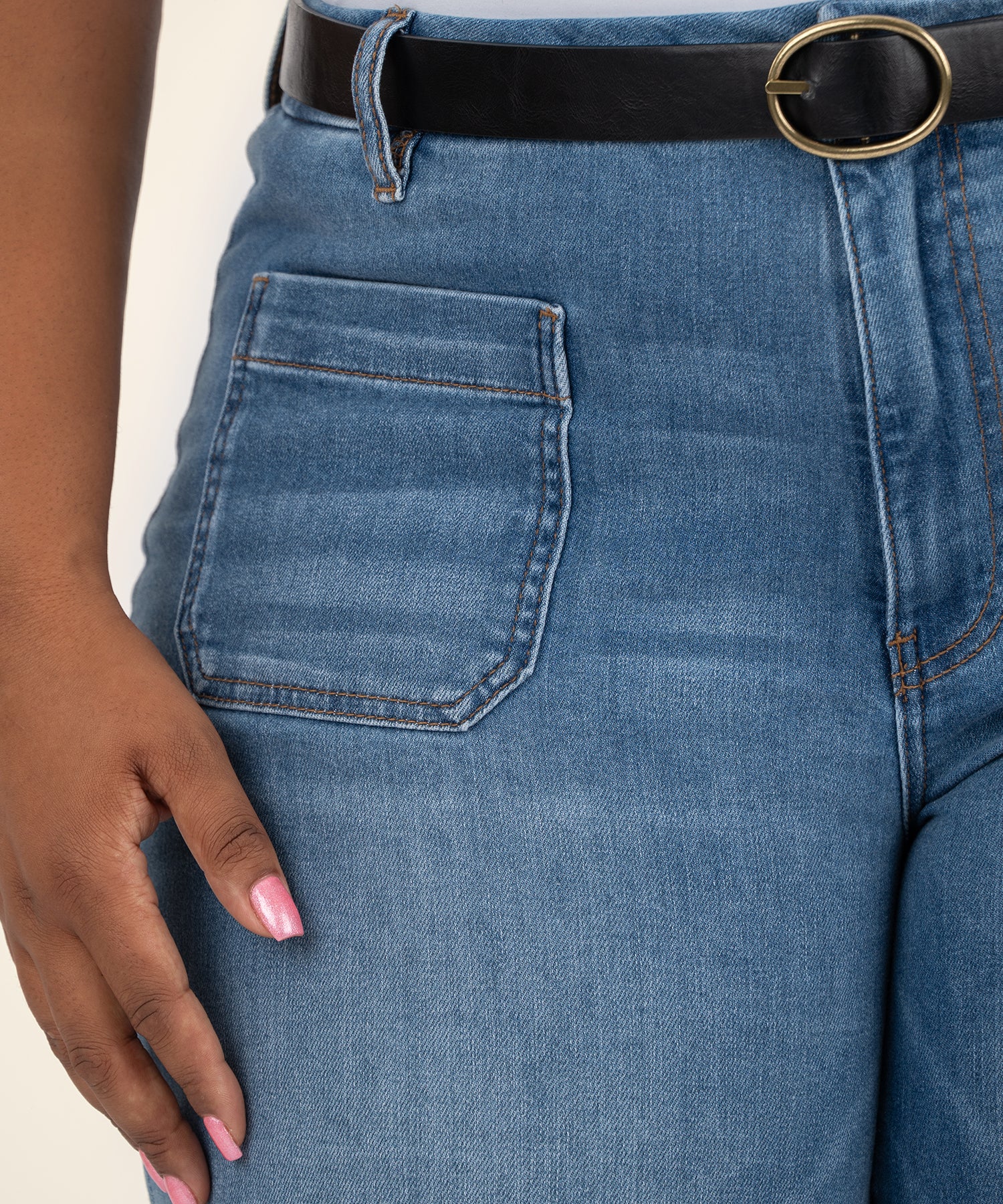 - These high-rise wide-leg jeans feature roomy patch pockets and a wide hem for a bold silhouette. Finished in a versatile medium wash with stretchy fabric, they deliver a trendy classic look perfect for any occasion.