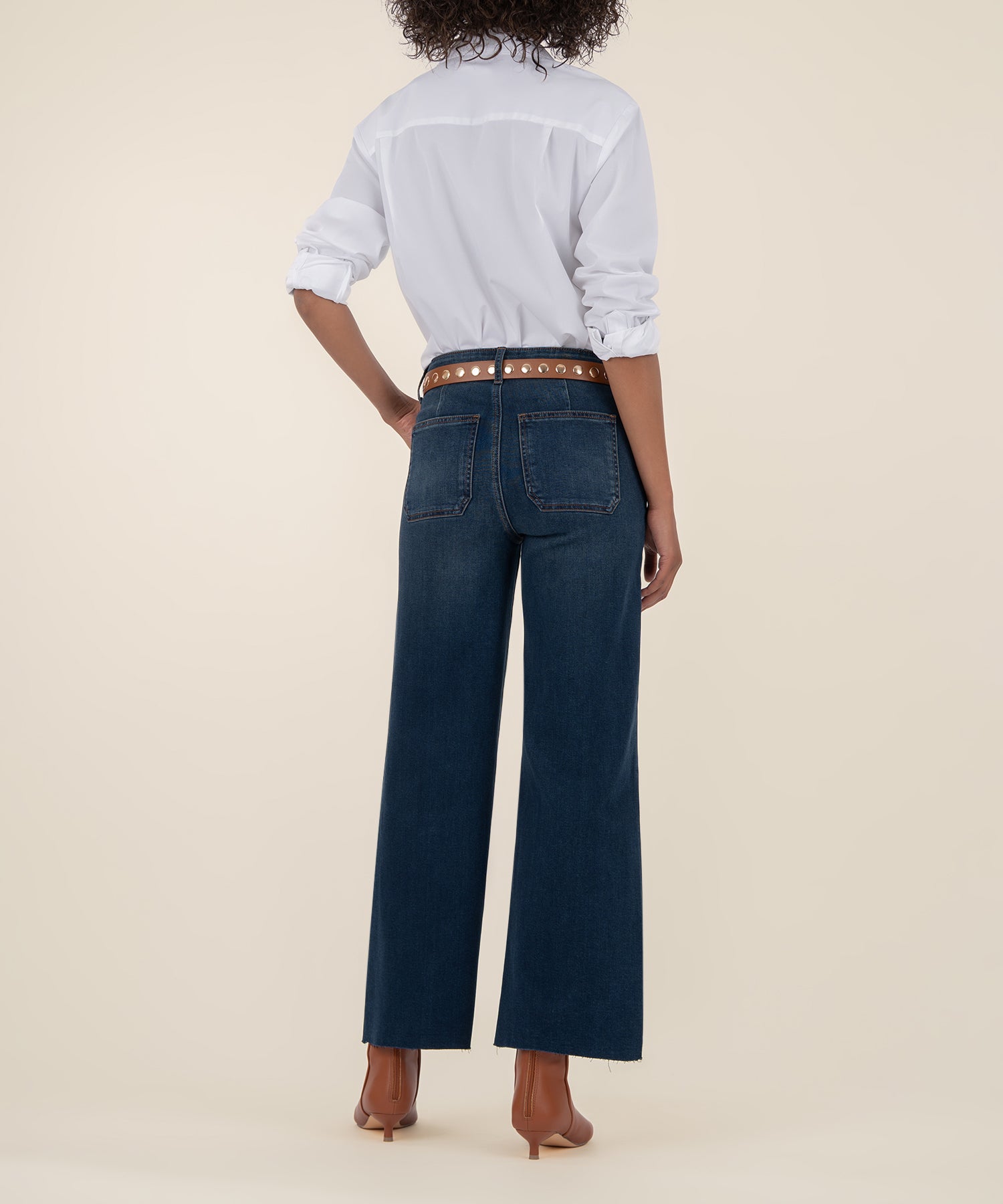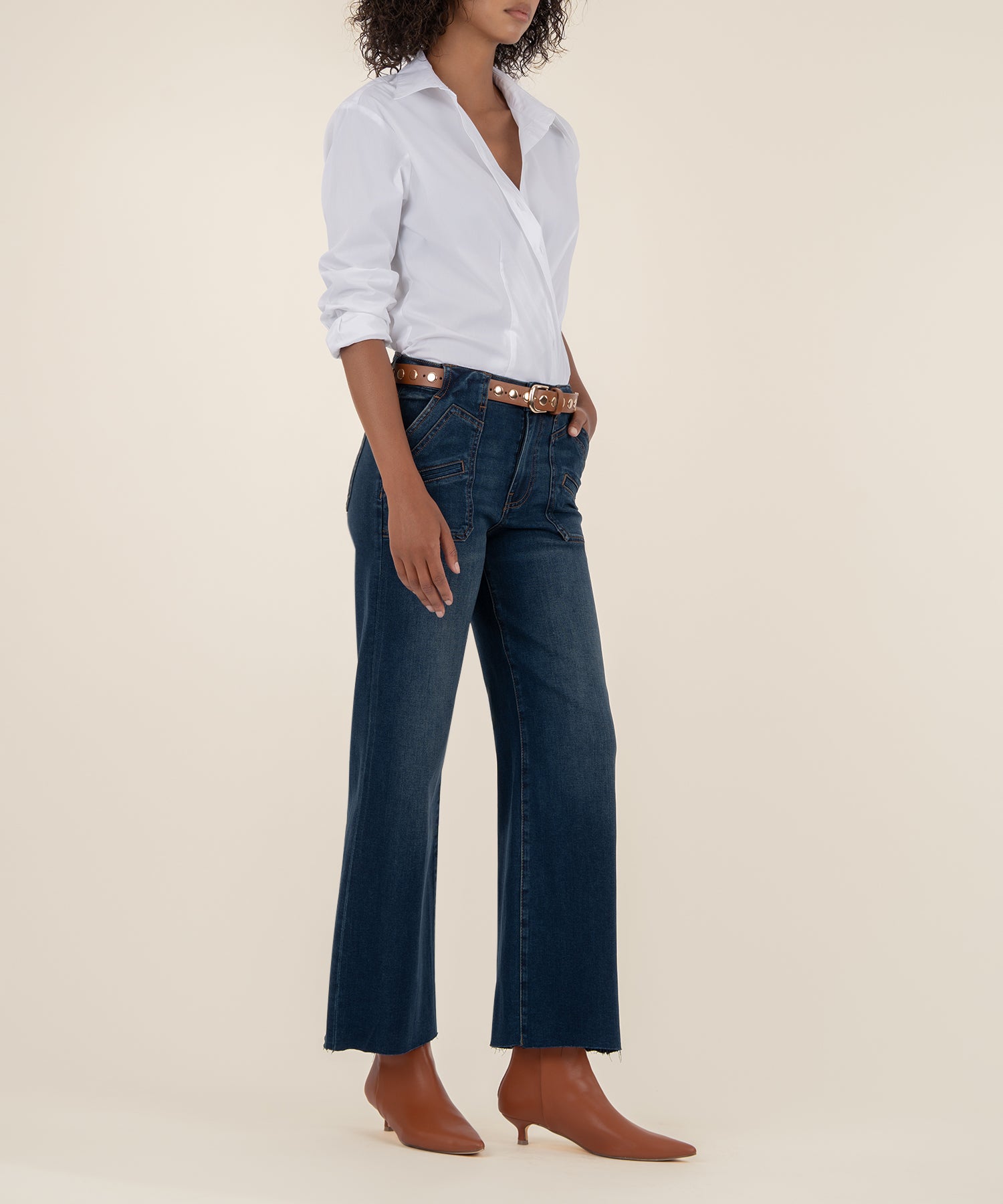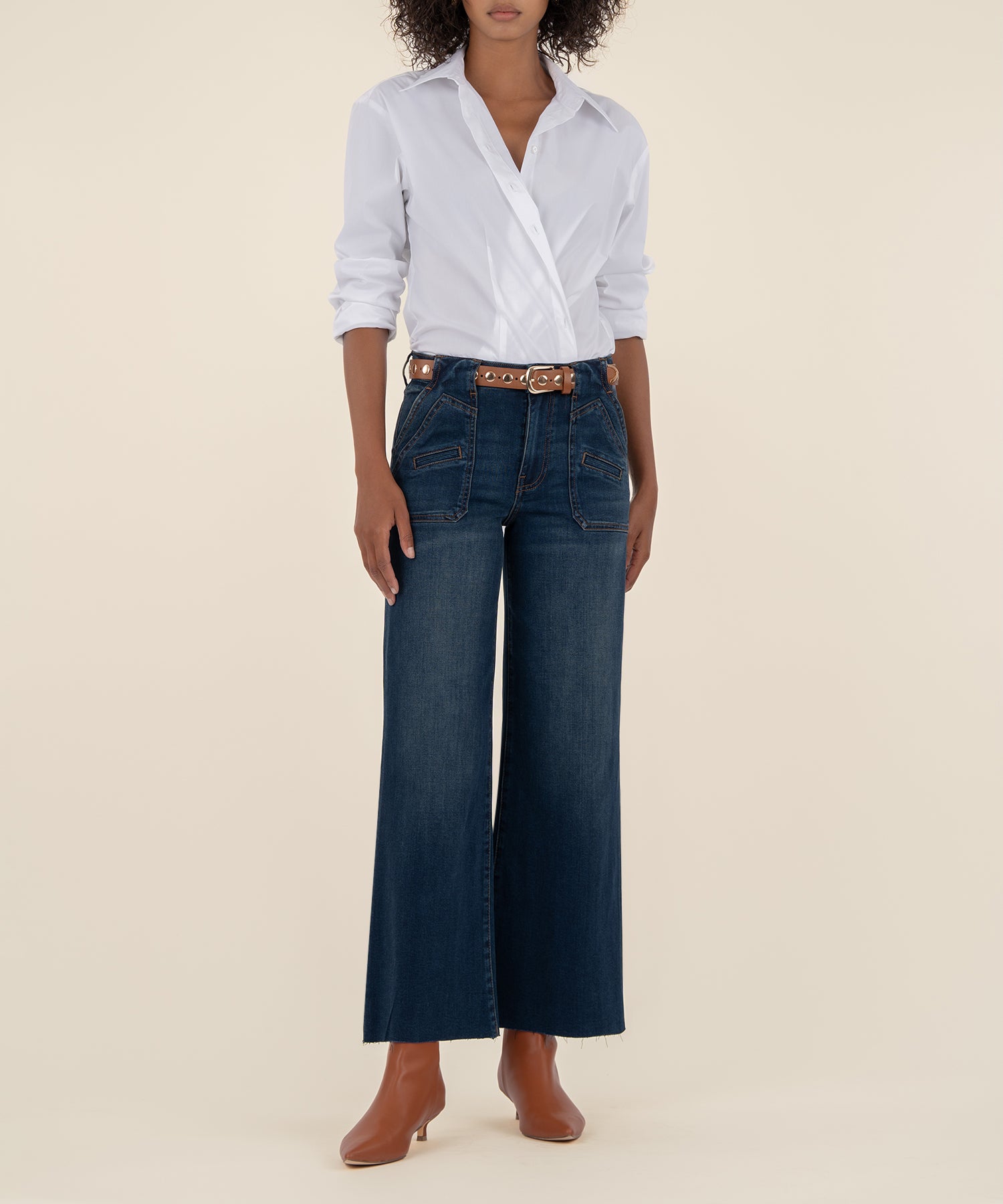 • Make a statement in these high-rise wide leg jeans in a rich dark wash, crafted from super stretchy material for ultimate comfort. Designed with porkchop pockets featuring an insert pocket, wider belt loops, and a raw hem, they blend utility-inspired details with a modern edge. A standout piece that’s both flattering and effortlessly cool.